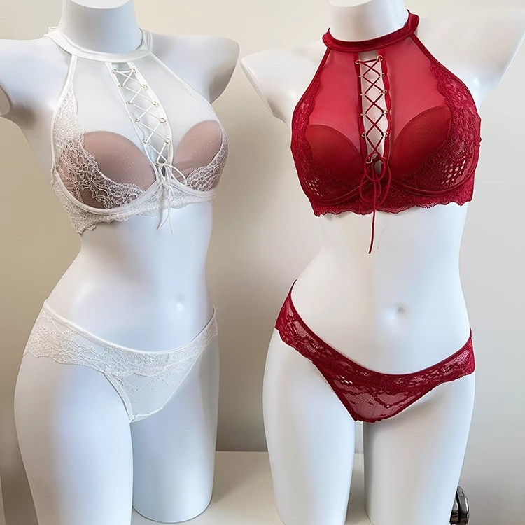 性感纯欲法式蕾丝绑带挂脖内衣套装女薄款小胸聚拢外穿黑色文胸罩
