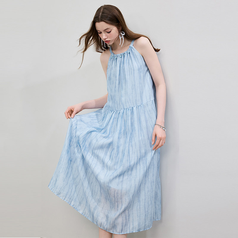 KBNE吊带连衣裙女蓝色晕染长裙2025夏季新款小个子欧若风漂亮裙子