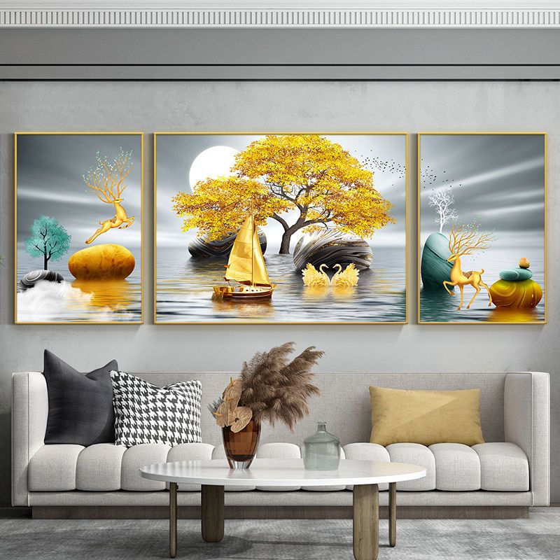 轻奢客厅背景墙装饰画现代简约沙发后墙面挂画大气招财三联画壁画