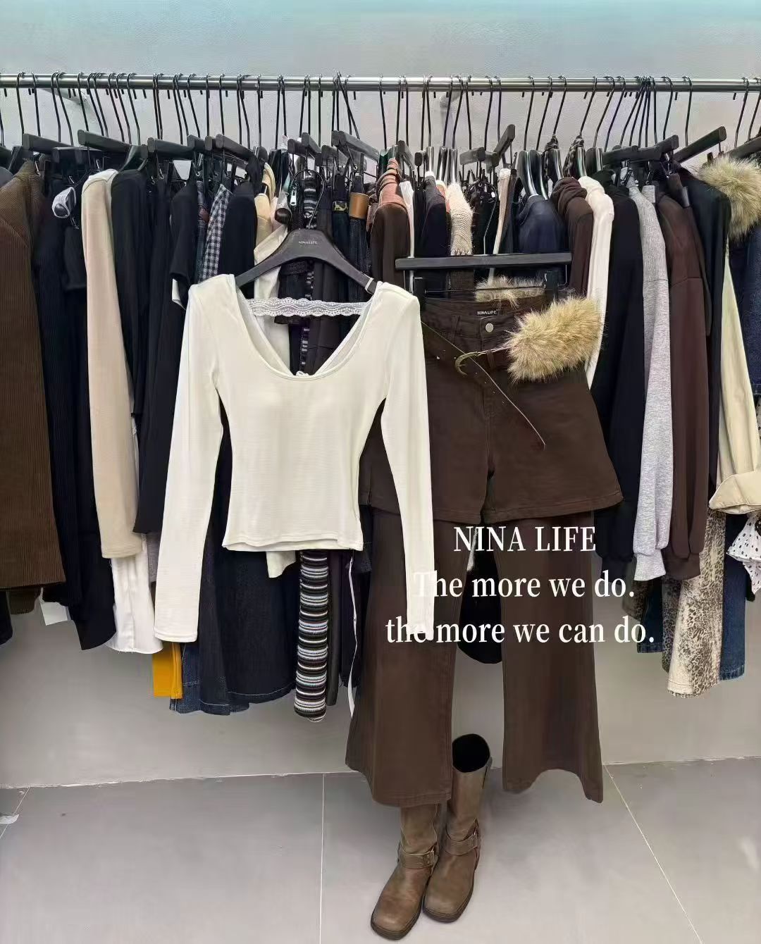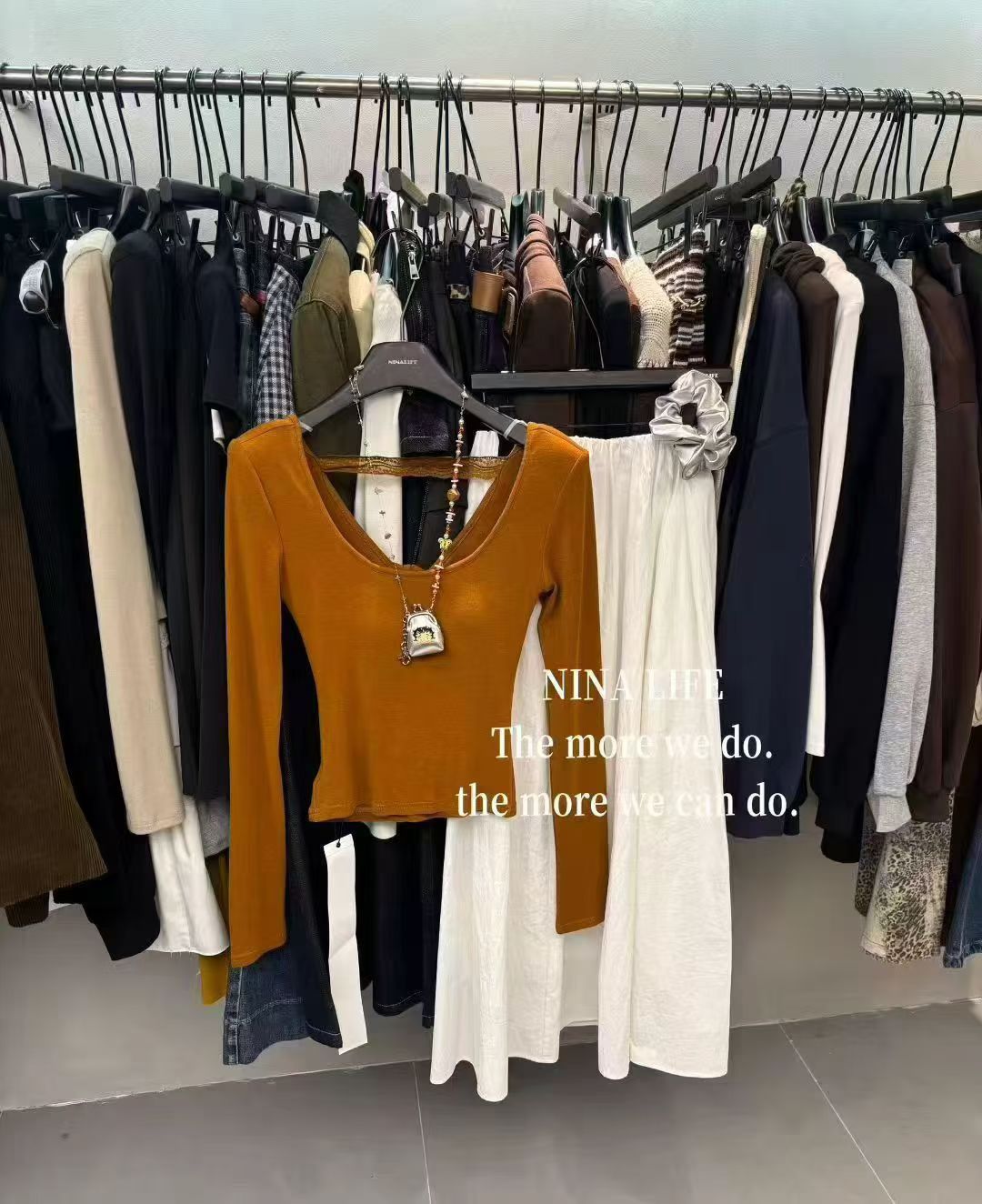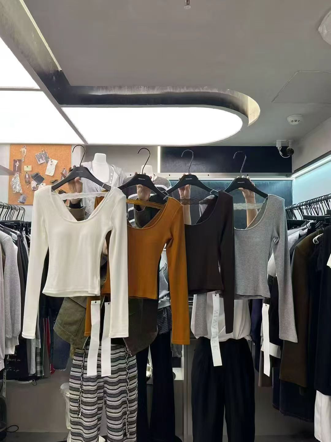 十三行2025秋新款时尚百搭磨毛短款显瘦U领露背长袖打底衫上衣女