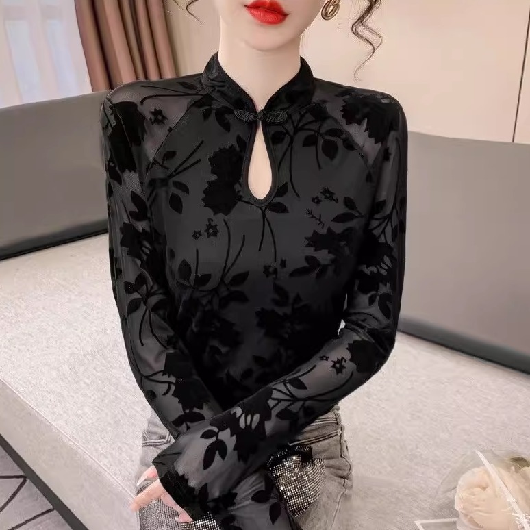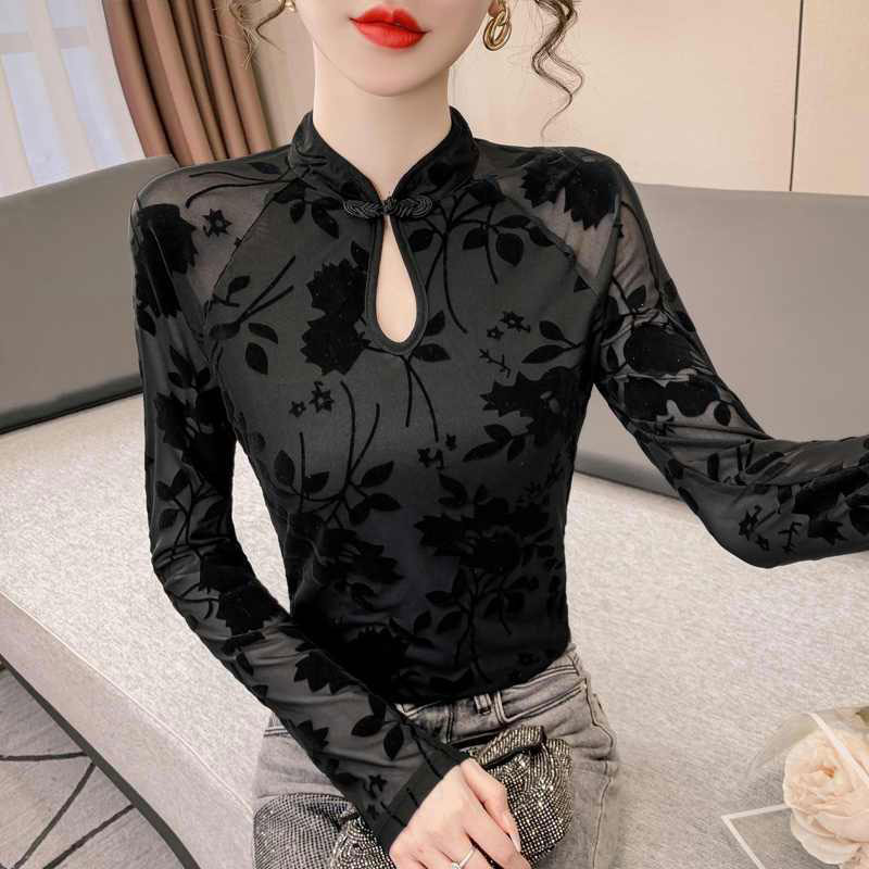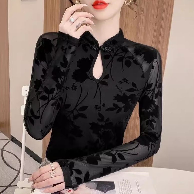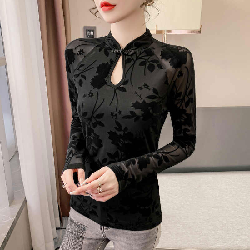植绒蕾丝打底衫女秋冬洋气复古旗袍领盘扣小衫网纱内搭长袖上衣薄