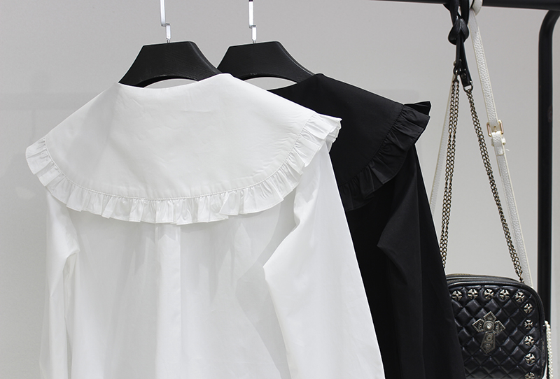 春秋季新款黑色白色娃娃领女衬衫木耳边大领子开襟气质衬衫有大码
