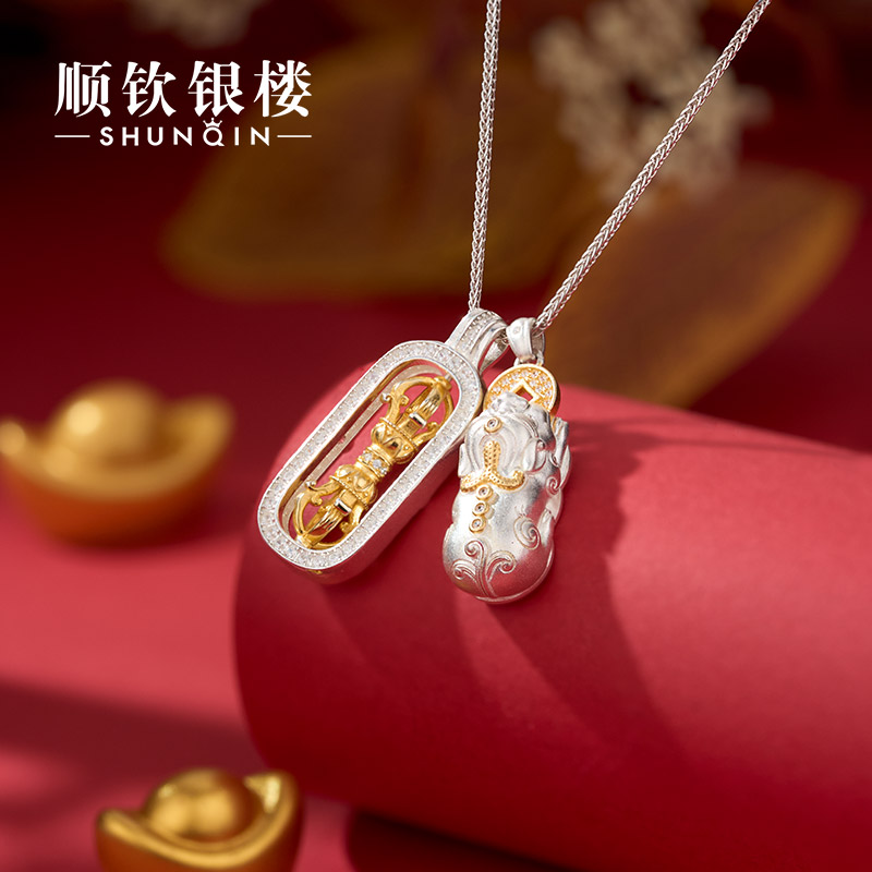 顺钦银楼S999纯银梵霄金刚杵貔貅吊坠富贵轻奢民族风项链礼物