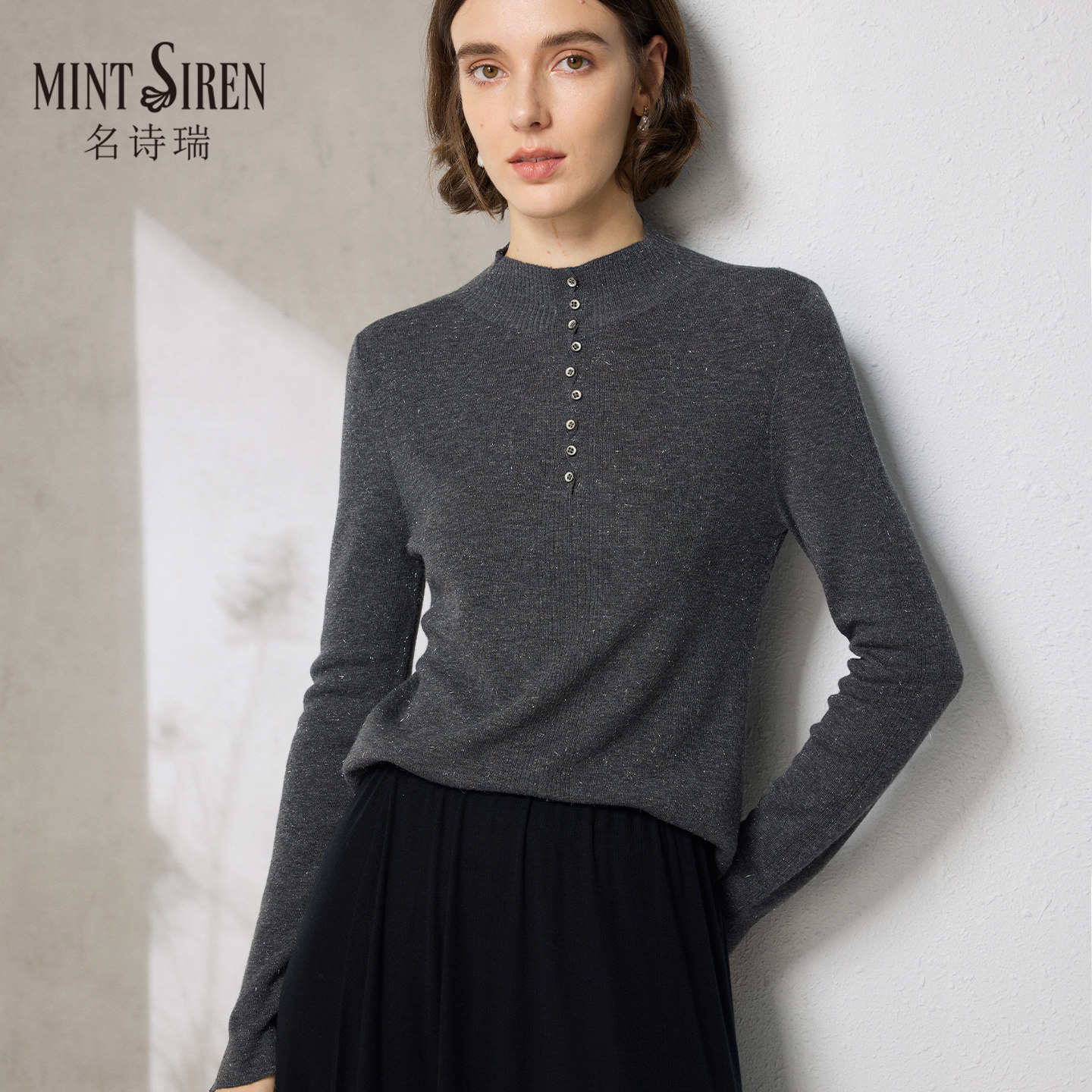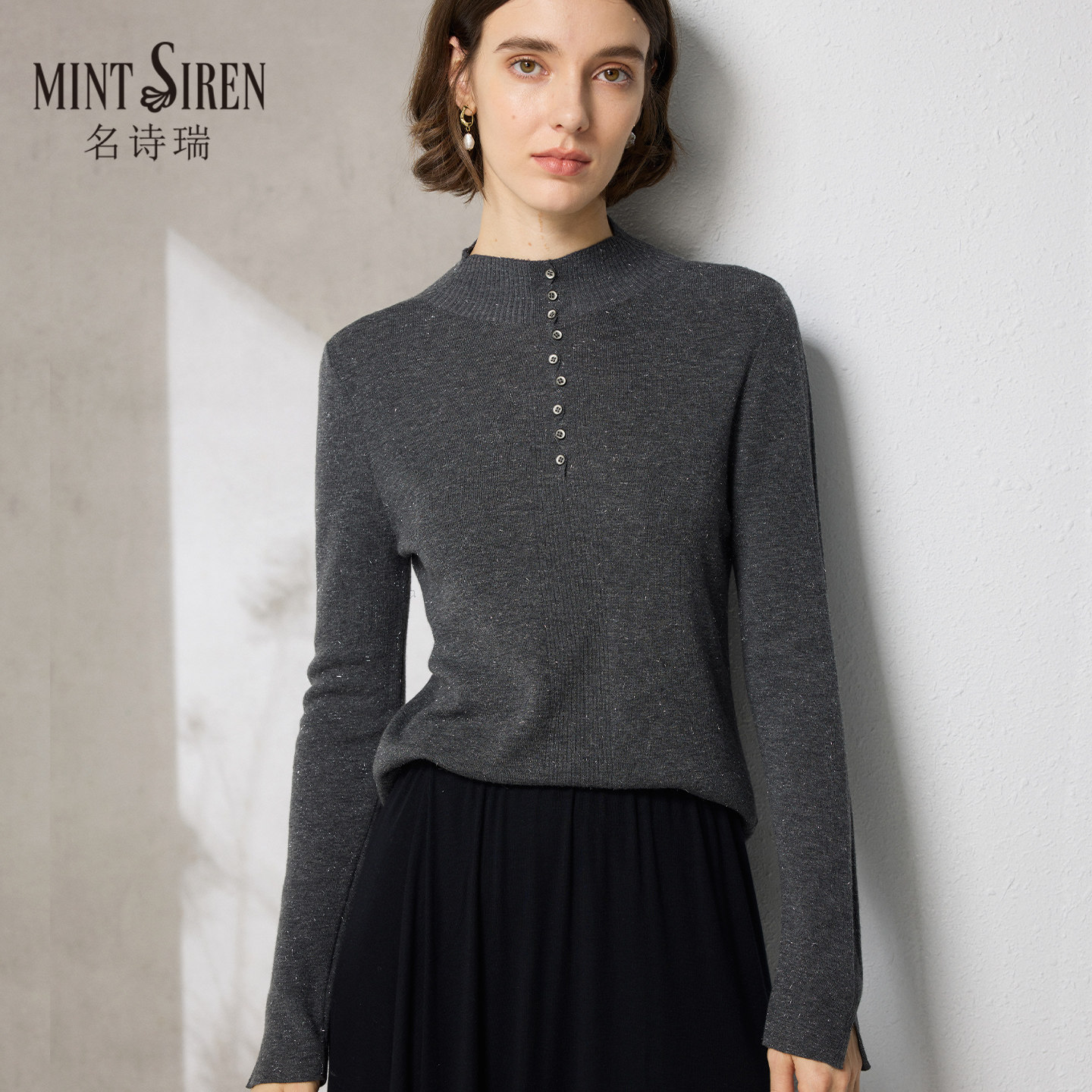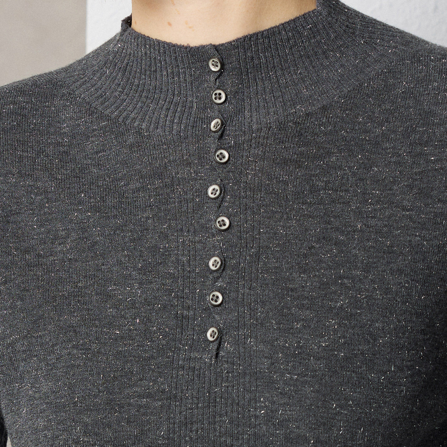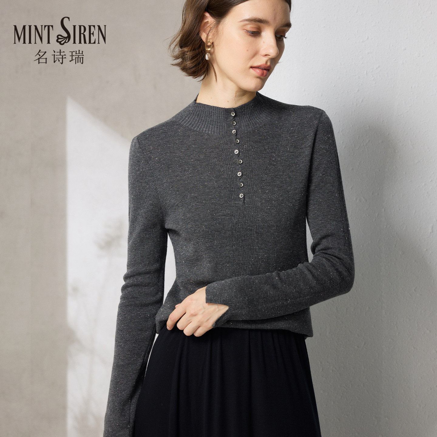 2026春秋新品纽扣半高领羊毛衫女长袖修身显瘦深灰色薄款打底毛衣