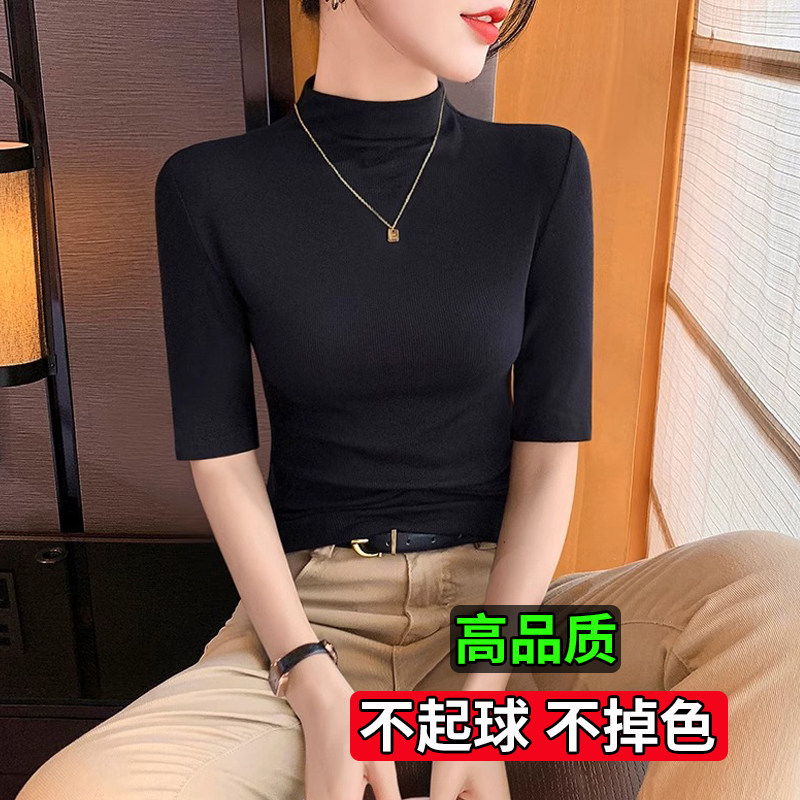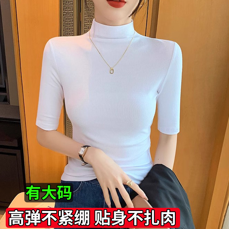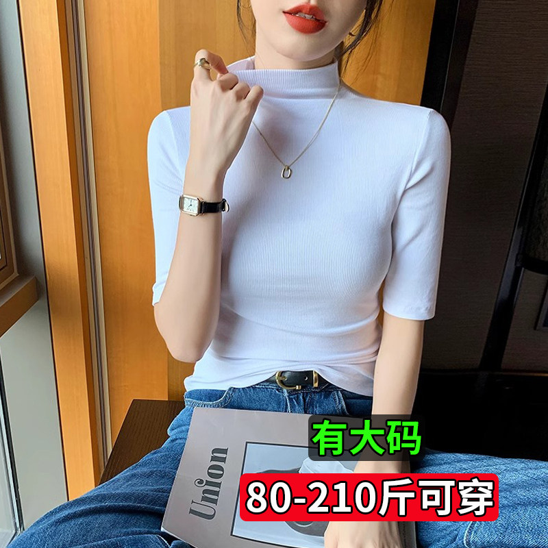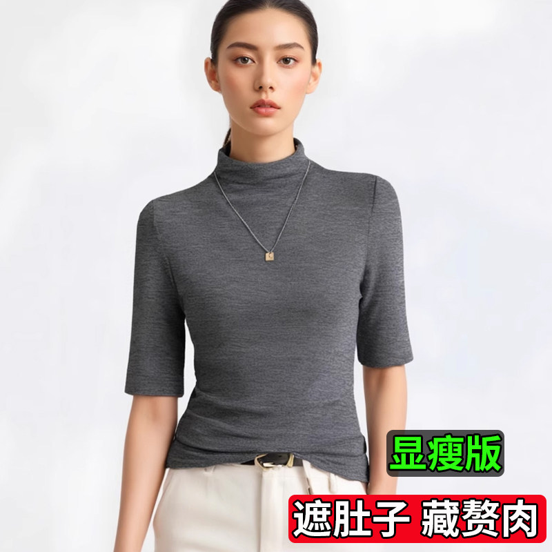 大码胖mm半高领中袖t恤女打底衫内搭2025新款春秋五分袖半袖上衣