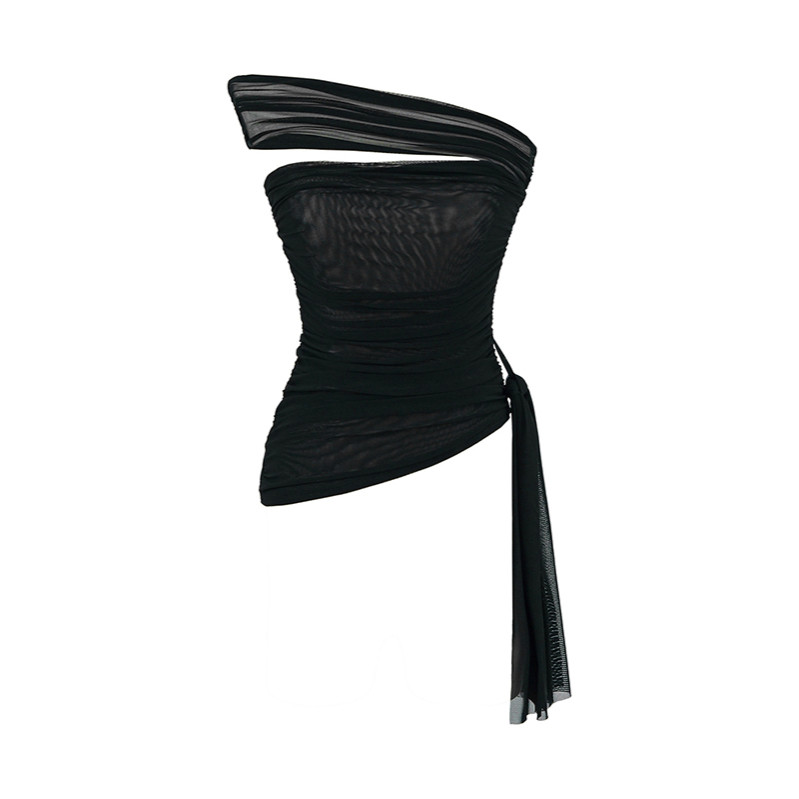 性感一字领露肩网纱短款上衣女夏季新款褶皱飘带修身显瘦短袖T恤