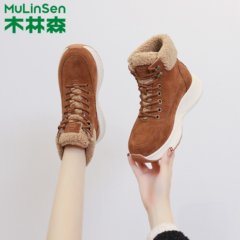 木林森女鞋2024冬季新款舒适厚底增高雪地靴子女休闲加绒保暖短靴