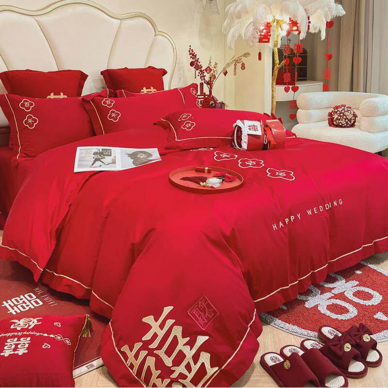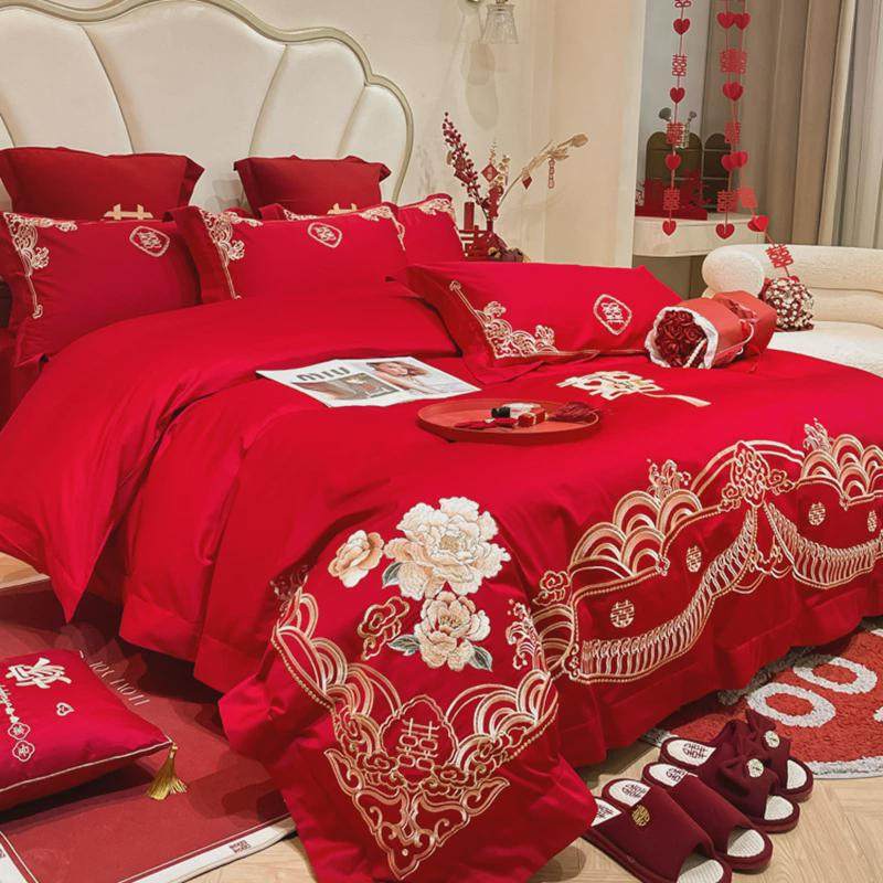 高档中式龙凤刺绣结婚四件套大红色床单被套亲肤棉喜被婚庆床品