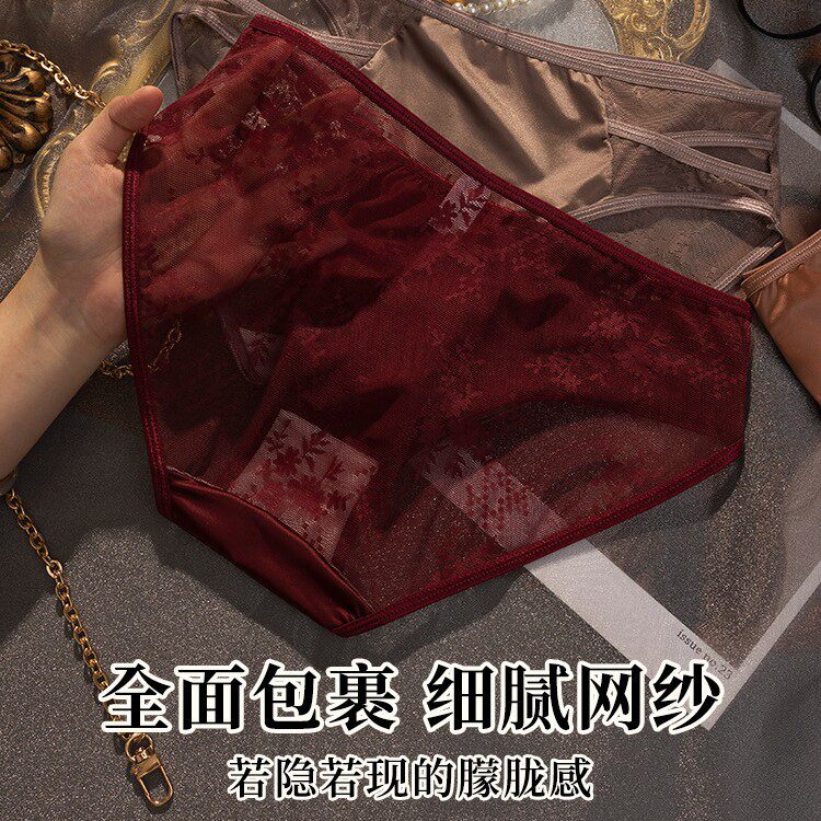 性感红紫镂空女士内裤薄款蚕丝裆纯欲蕾丝缎面透气大码三角裤