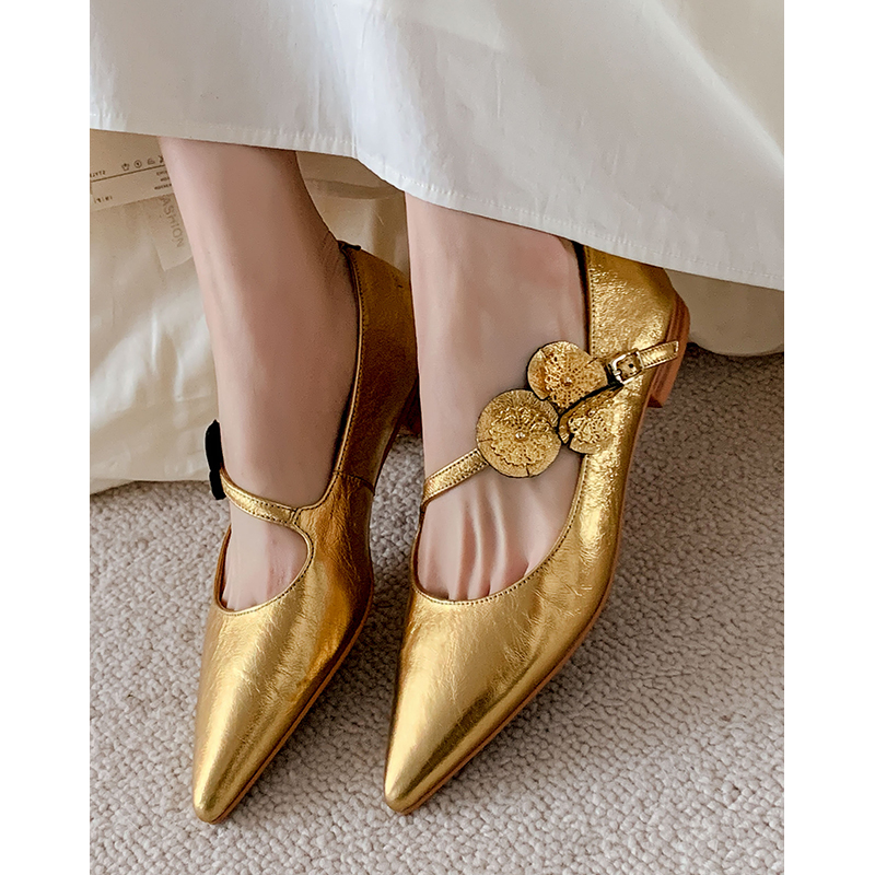 Kmeizu巨软~花朵玛丽珍鞋女春新款羊皮尖头一字扣带瓢鞋平底单鞋