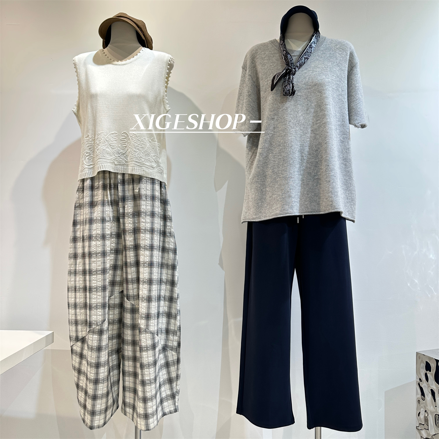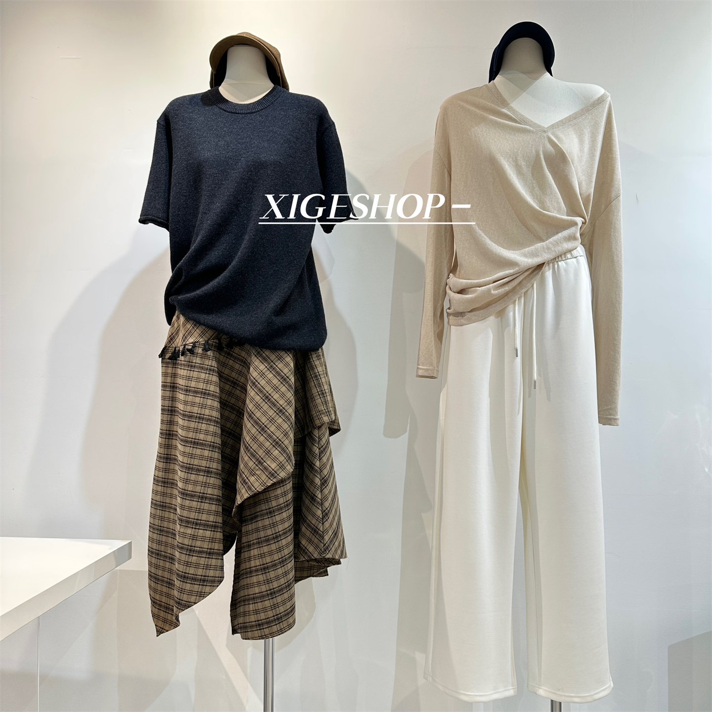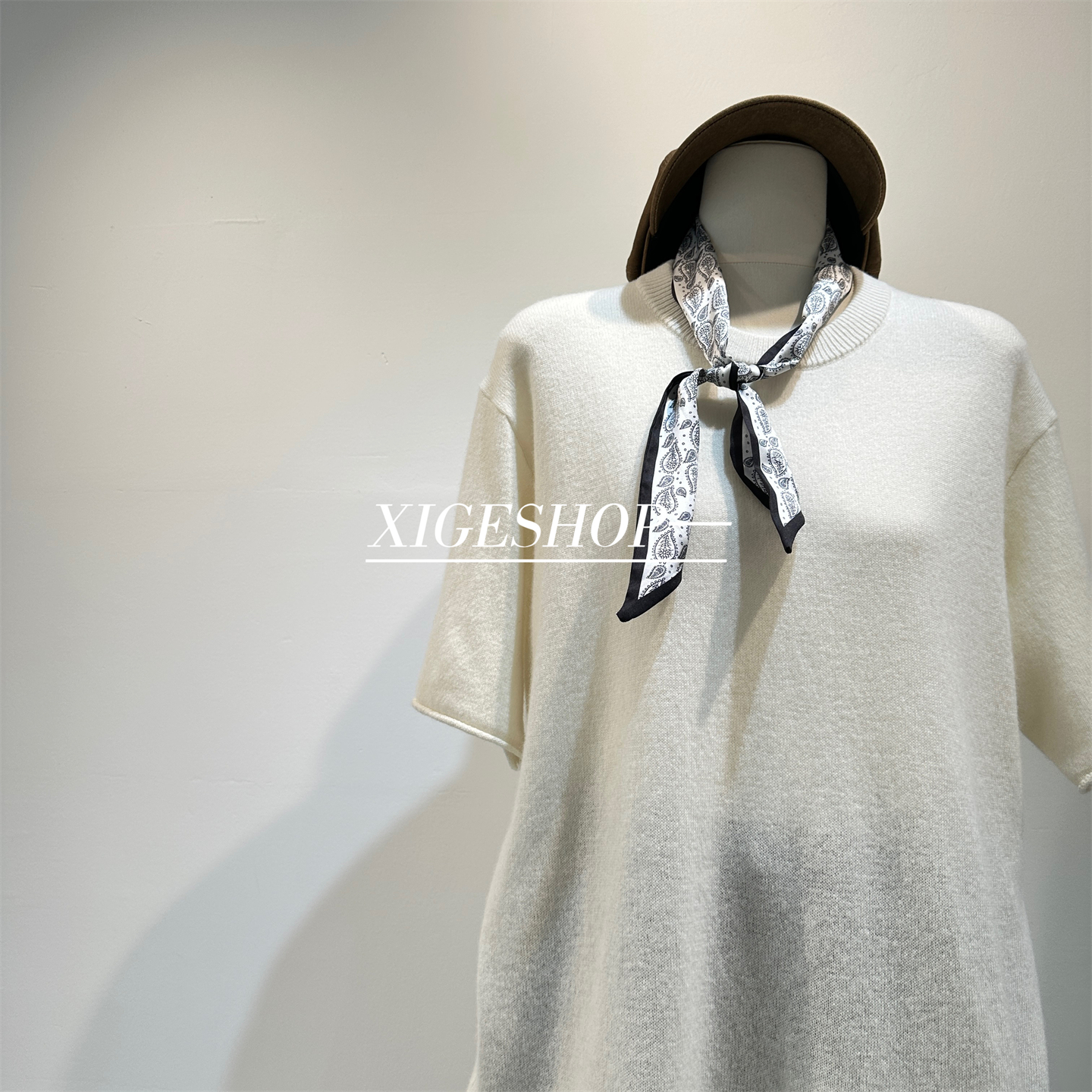 極简R风空气感卷边100绵羊毛短袖T恤早秋宽松气质慵懒圆领针织衫
