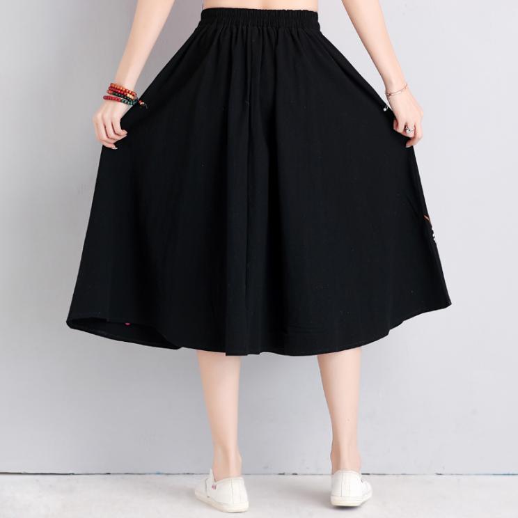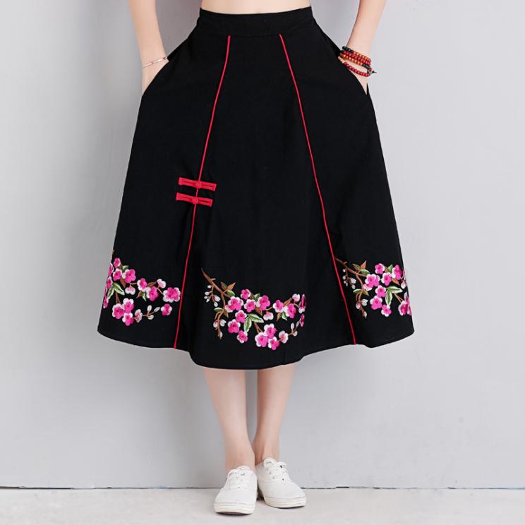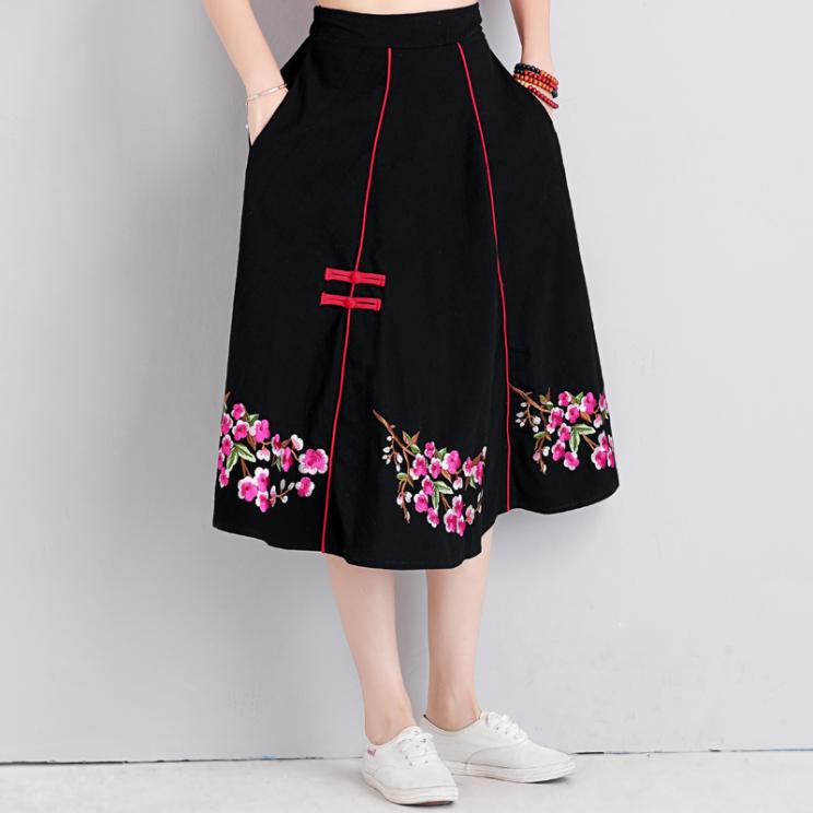 实拍春夏新品中国风绣花女棉麻拼接大摆裙中长半身裙