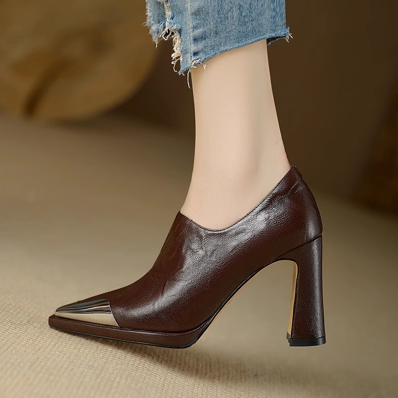 久站不累脚深口单鞋金属尖头气质防水台高跟鞋女2025新款英伦皮鞋