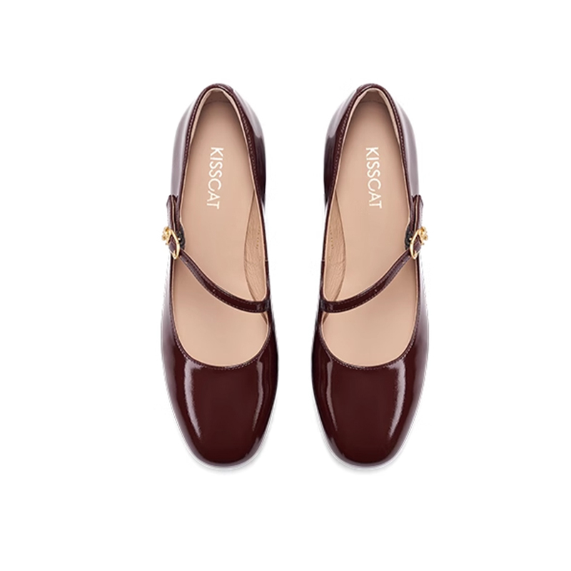 KISS CAT/接吻猫春秋牛漆皮圆头玛丽珍鞋粗高跟单鞋女KA54138-10