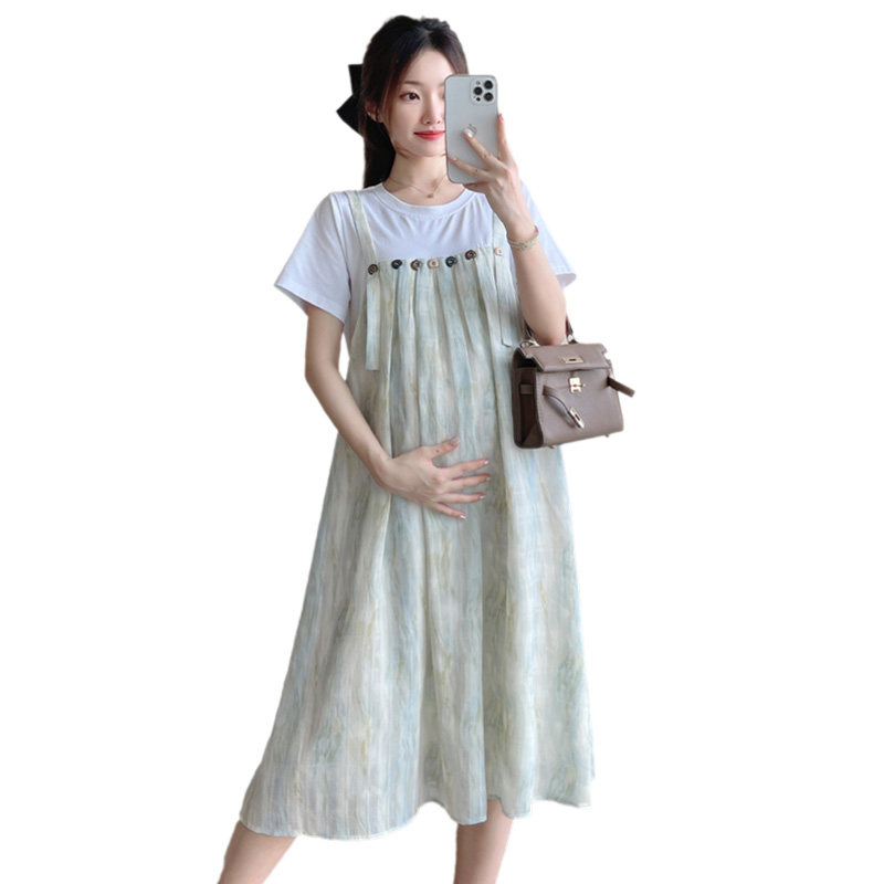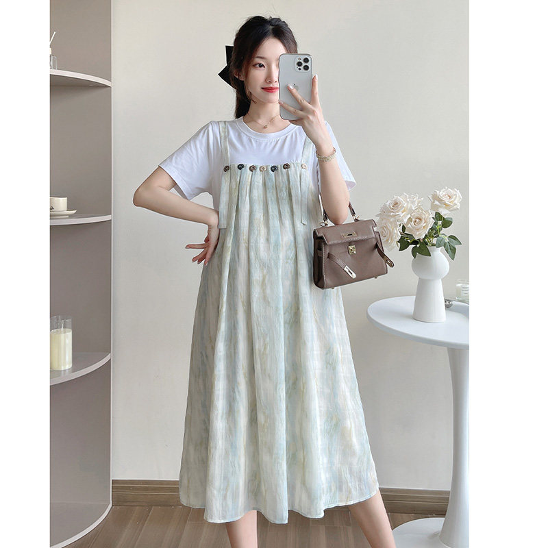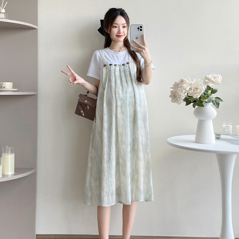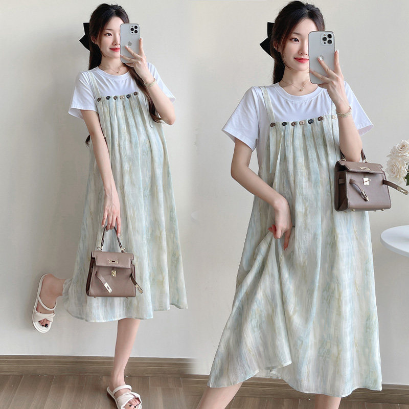 孕妇装夏天裙子中长款网红潮妈夏季薄款假两件宽松遮肚雪纺连衣裙