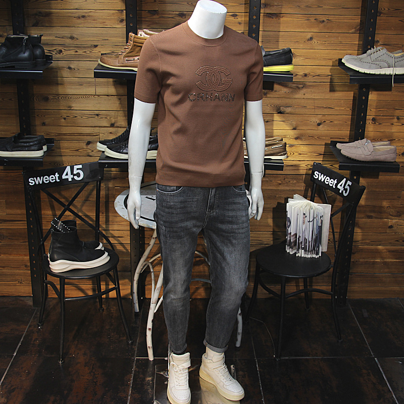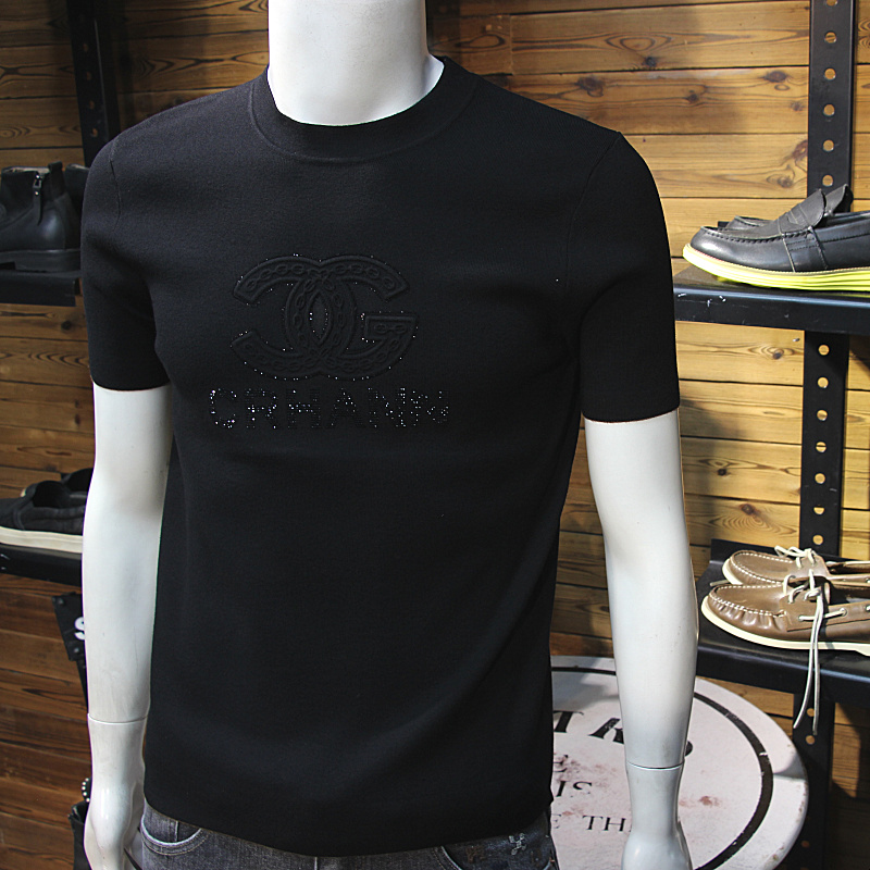 秋冬男天丝针织短袖简欧立体图标时尚烫钻修身圆领毛衣T恤半袖衫