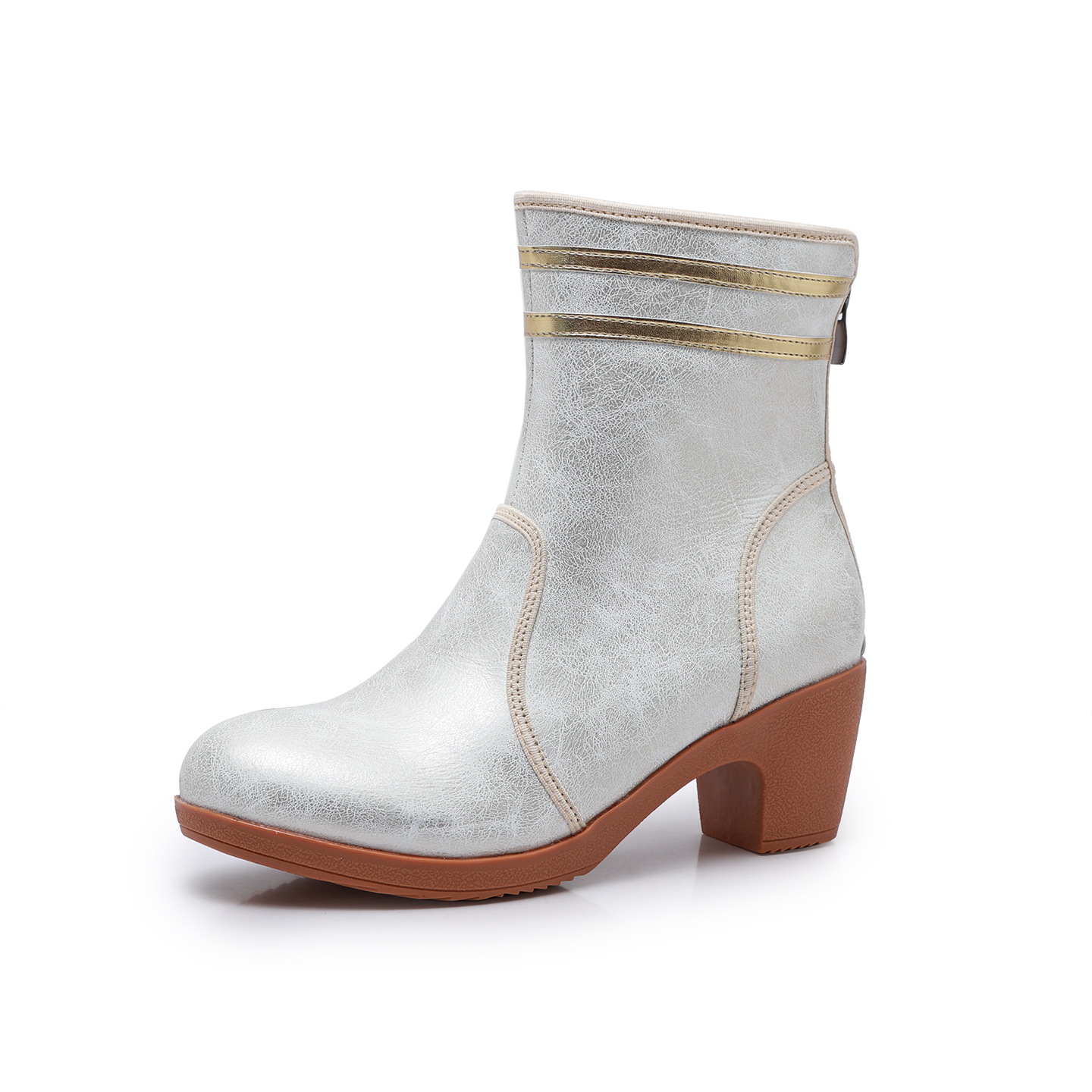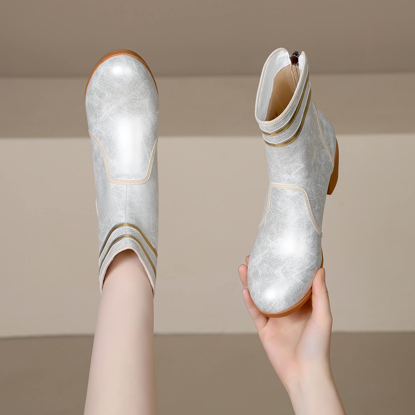 国风银色中筒妈妈鞋粗跟广场舞短靴2025新款时尚舒适秋冬舞蹈靴子