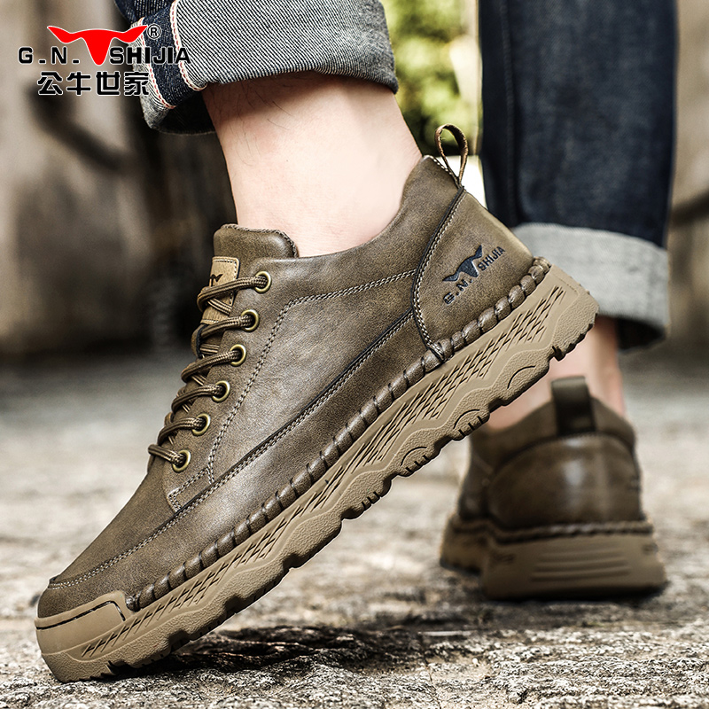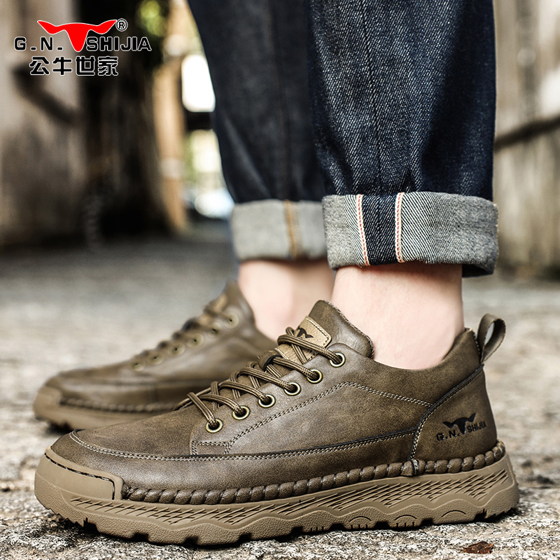 公牛世家男士皮鞋秋季低帮复古皮面休闲板鞋男款防滑耐磨工装鞋男