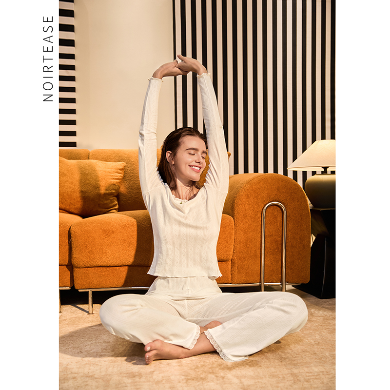 NT秋冬纯棉慵懒风睡衣女士全棉提花长袖裤修身显瘦家居服两件套装