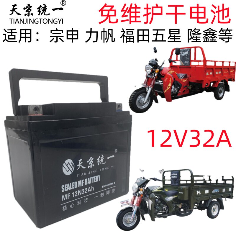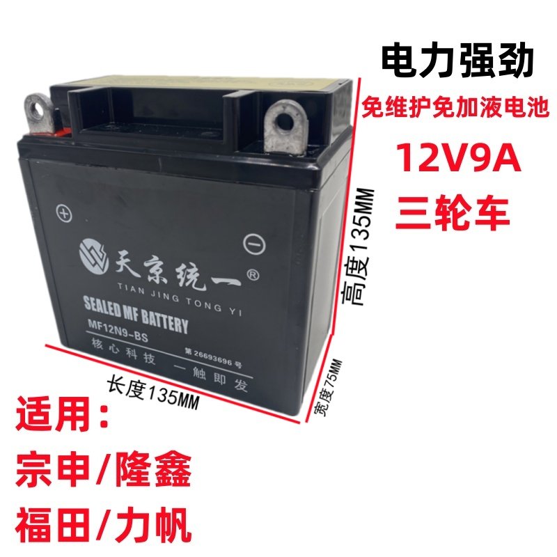 天京统一汽油三轮摩托车电瓶12V9A1232A免维护蓄电池宗申福田隆鑫