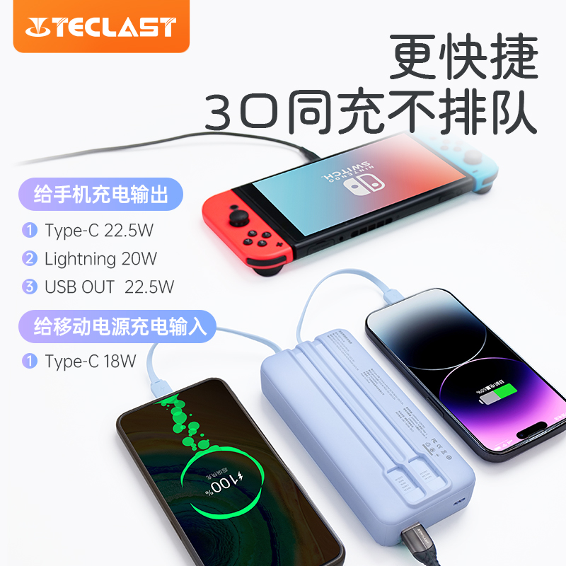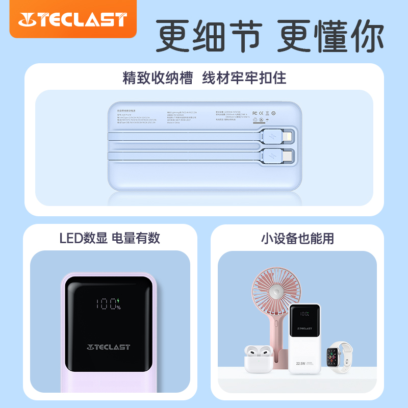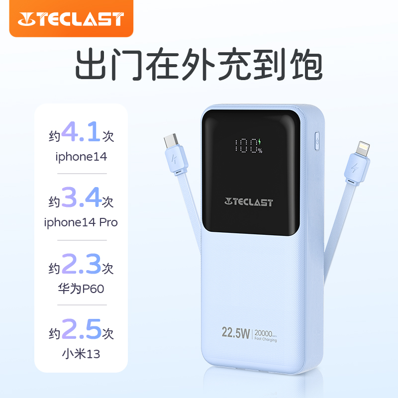 台电手提式充电宝20000毫安大容量2024新款自带线22.5W快充超薄迷你小巧便捷式移动电源适用华为小米苹果专用