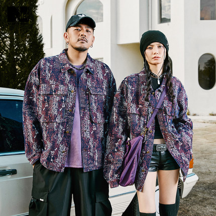 NMAX大码潮牌男装秋季新款酱果紫拼色提花牛仔外套复古风夹克