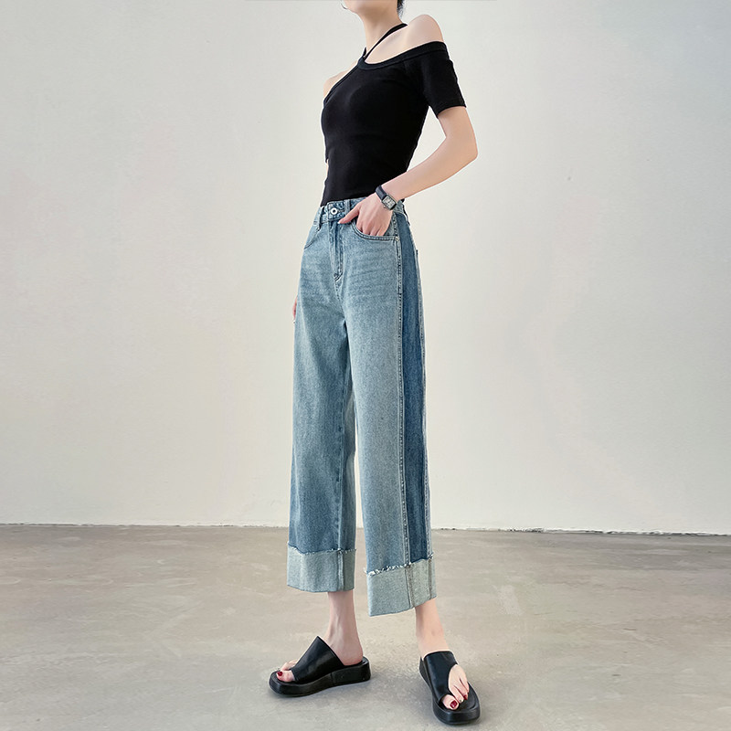 断码清仓九分阔腿牛仔裤女高腰宽松翻边小个子八分撞色小直筒裤子