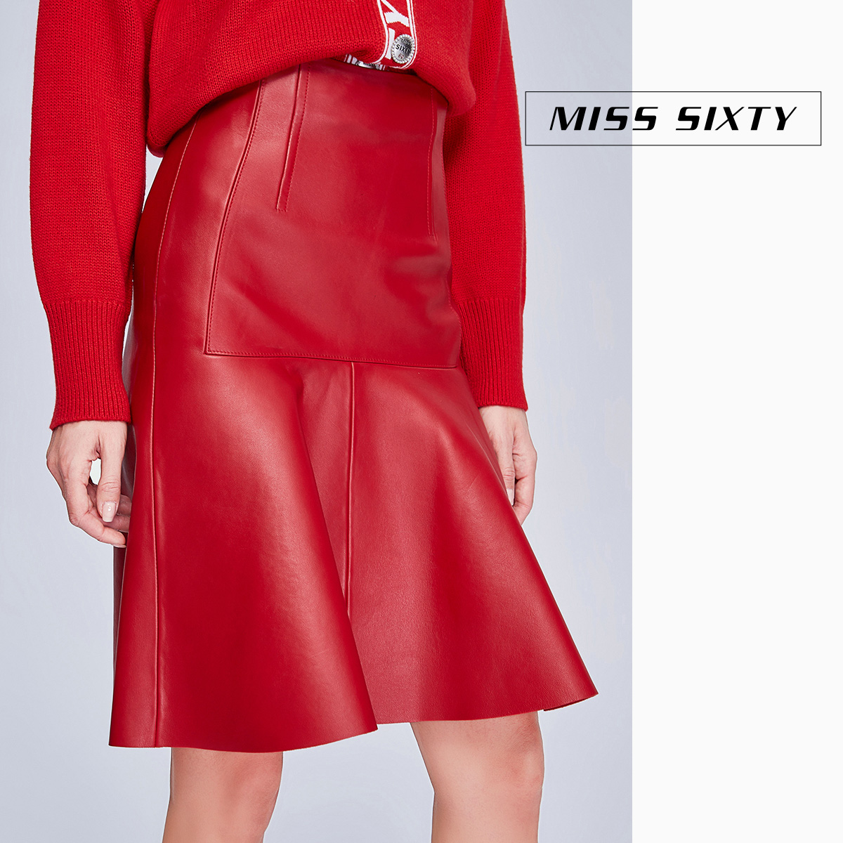 Miss Sixty春秋高腰A字中裙绵羊皮真皮半身裙女
