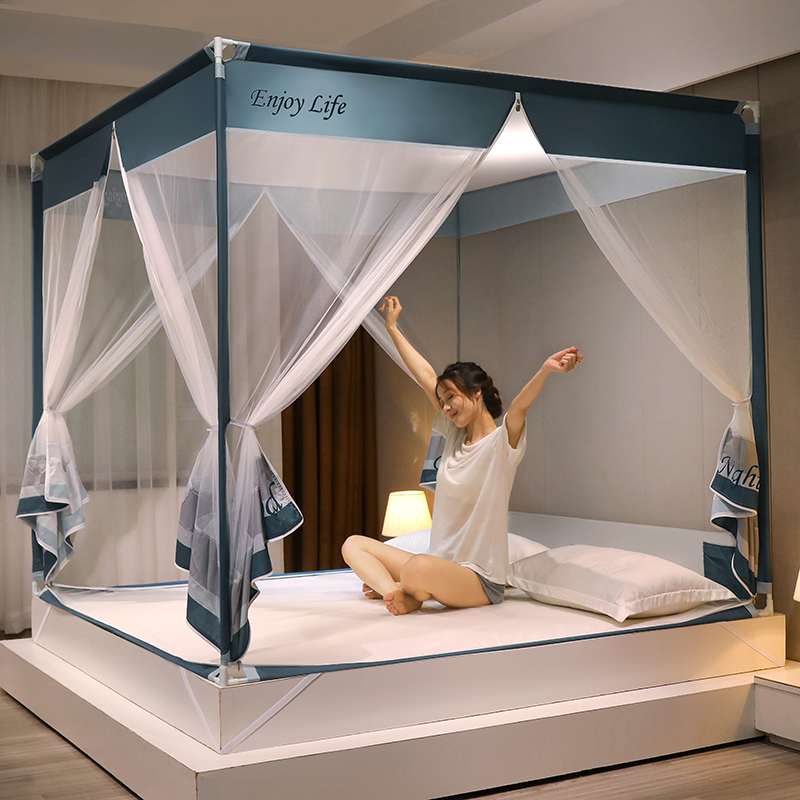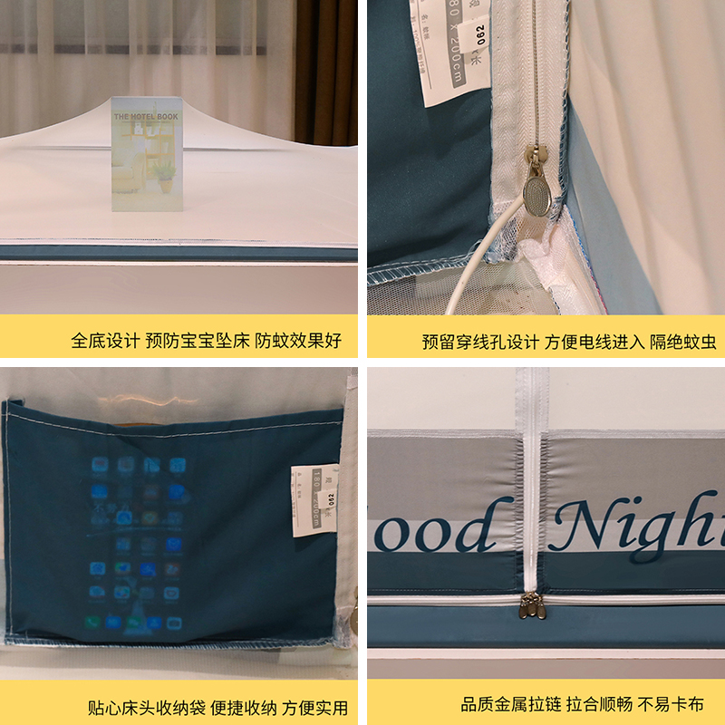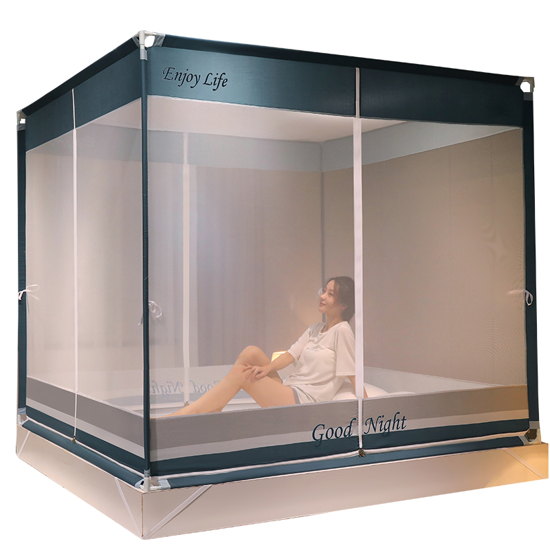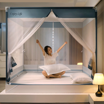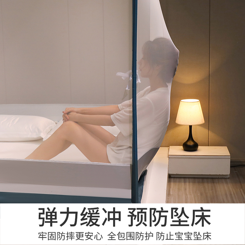 简约坐床式蚊帐家用三开门儿童防摔全底拉链款蒙古包加密加厚支架