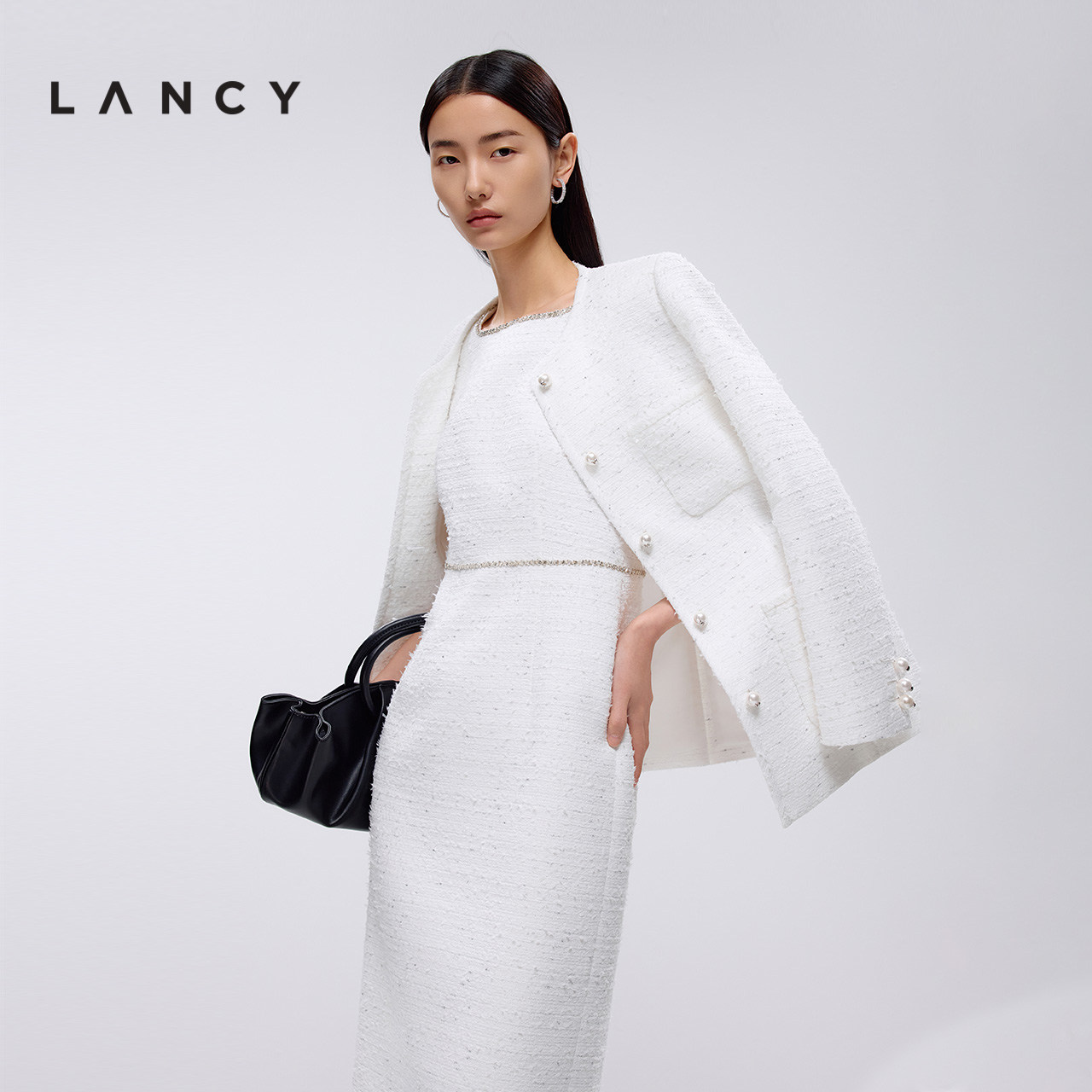 LANCY/朗姿2025春新款小香风无袖收腰气质羊毛连衣裙精致小礼服