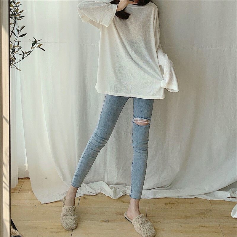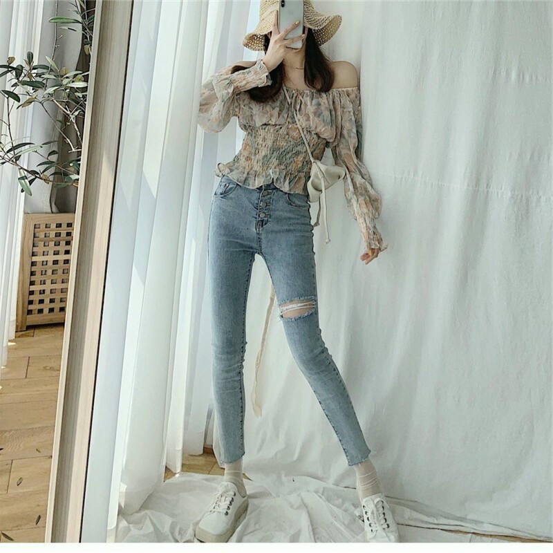 破洞牛仔裤子女夏秋韩国高腰铅笔裤修身显瘦九分裤紧身弹力小脚裤