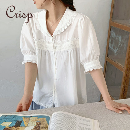 CRISP日系穿搭蕾丝边短袖衬衫女小翻领白色纯棉上衣2025夏季新款