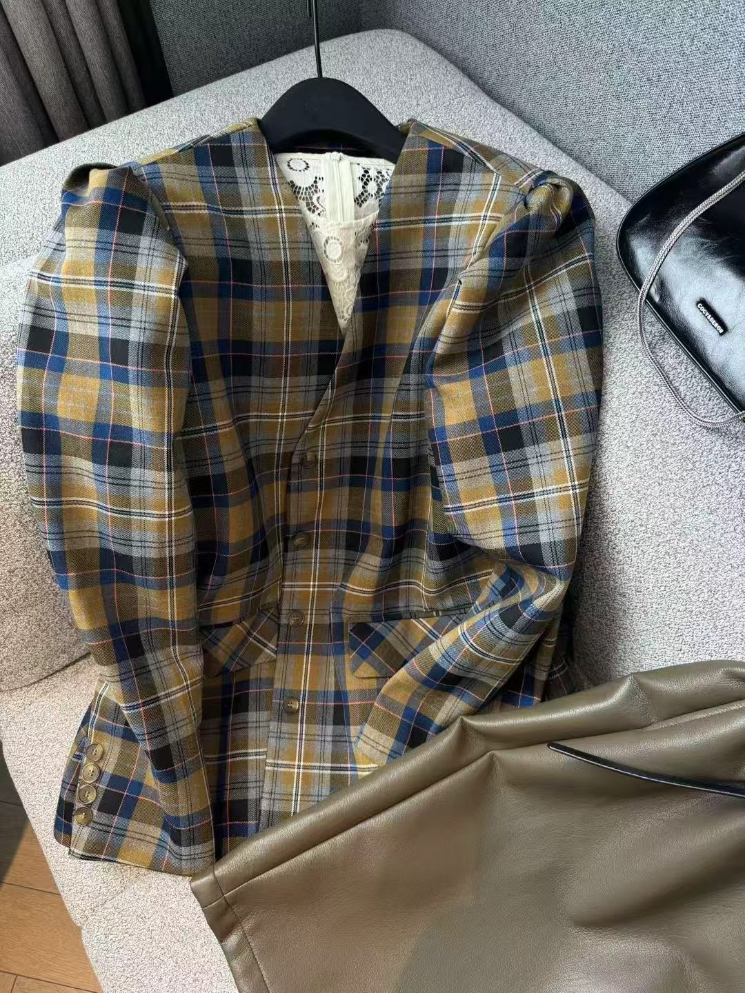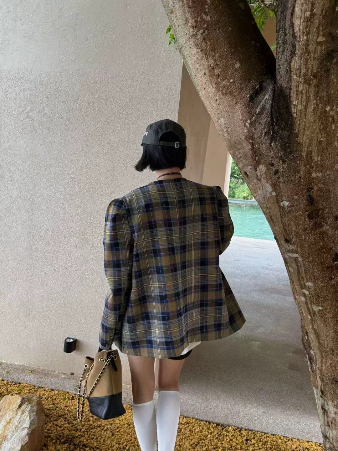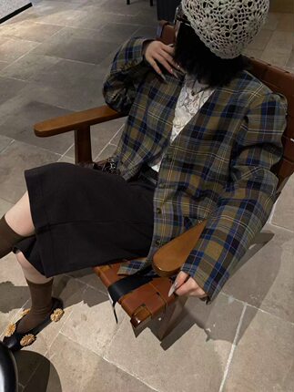 韩国东大门新款韩系ins风宽松洋气格子单排扣西装外套女