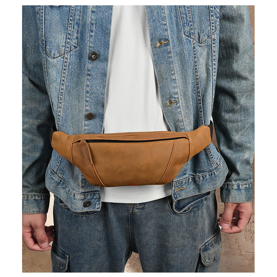 简约复古男士疯马皮腰包头层牛皮斜挎包真皮户外运动骑行男包胸包
