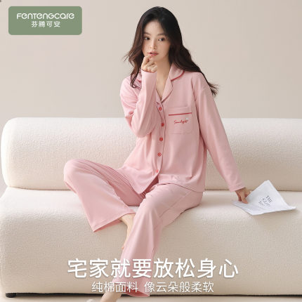芬腾可安长袖睡衣女款秋冬款纯棉女士粉色家居服秋季冬天2025新款