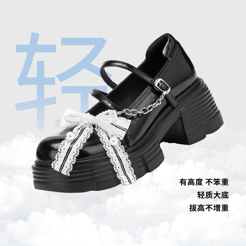 热风粗跟玛丽珍鞋女2025年秋季新款蝴蝶结蕾丝小皮鞋高跟百搭鞋子