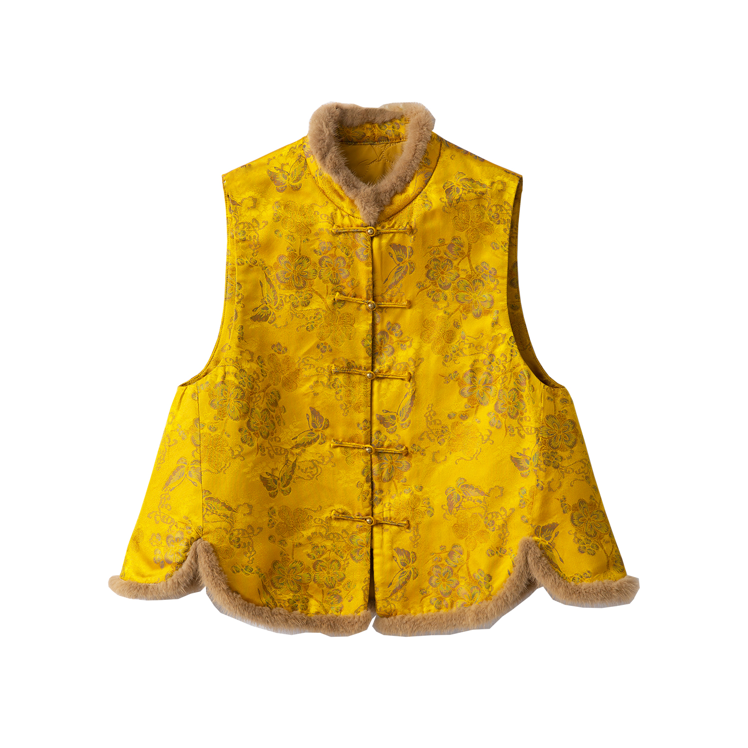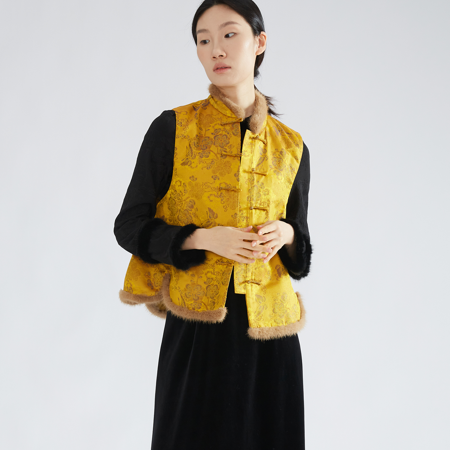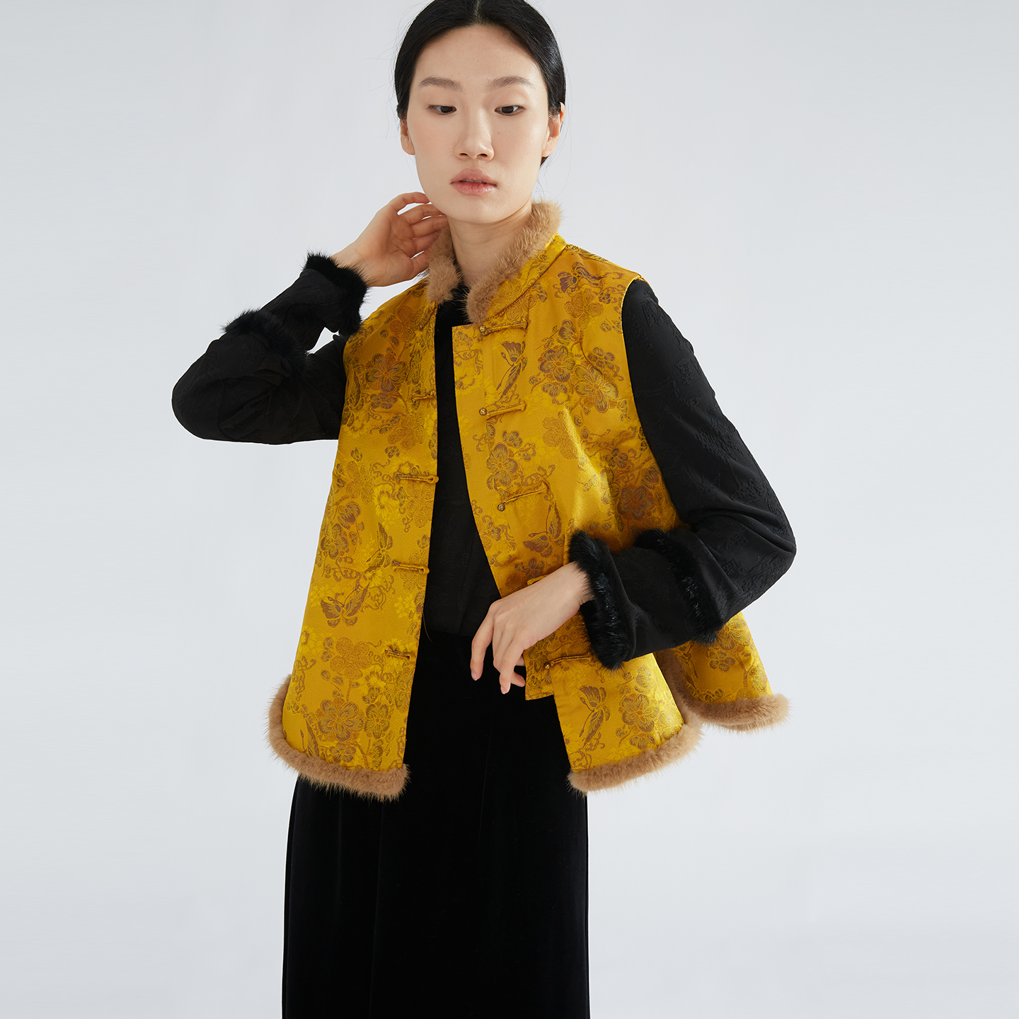一丝牵 水貂毛国风提花貂毛真丝马甲女新中式桑蚕丝小袄夹棉背心