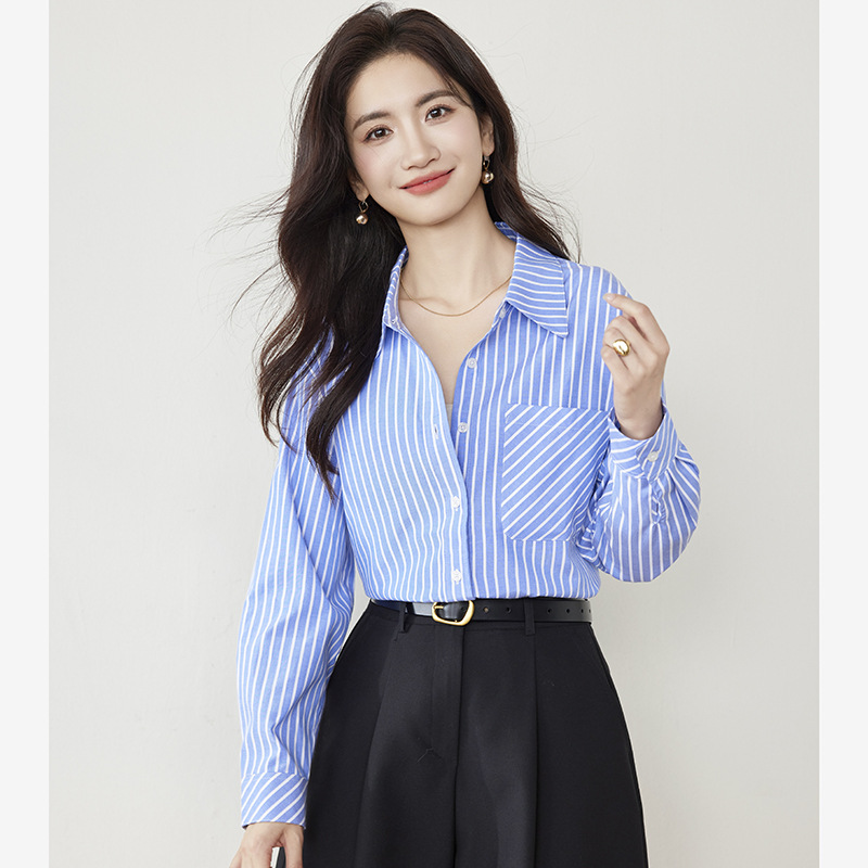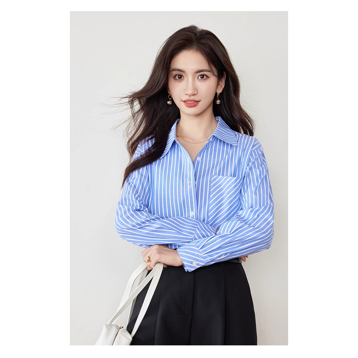实拍蓝色条纹衬衫女2025秋装新款设计感宽松显瘦气质通勤长袖衬衣