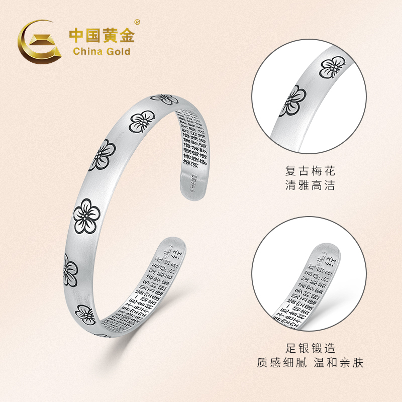 中国黄金足银999手镯梅花心经开口女镯子纯银送女友生日礼物