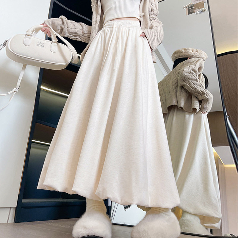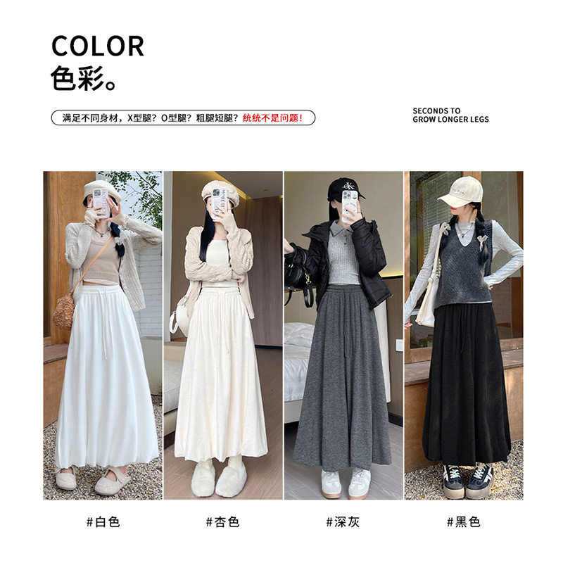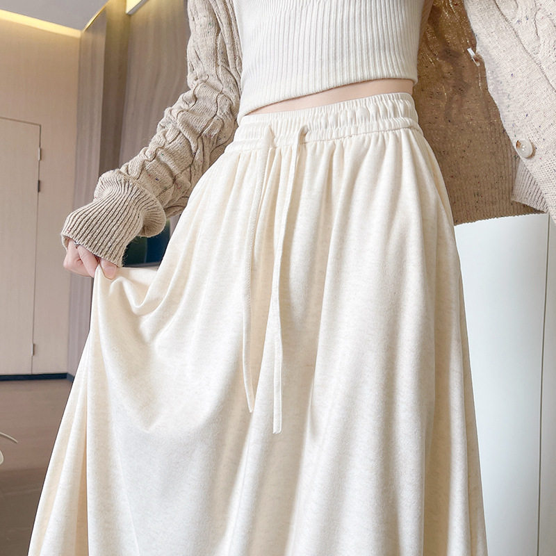 杏色花苞针织糯米加绒加厚半身裙女秋冬季中长款高腰a字伞裙半裙
