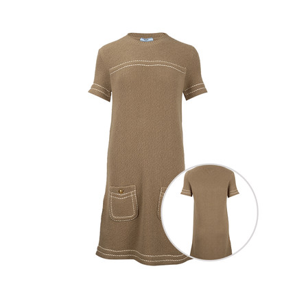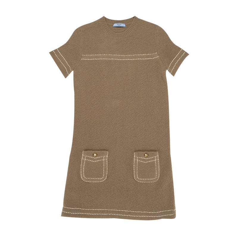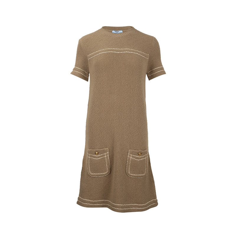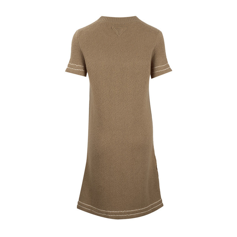 PRADA普拉达女士纯色羊绒针织圆领套头短袖连衣裙女春夏