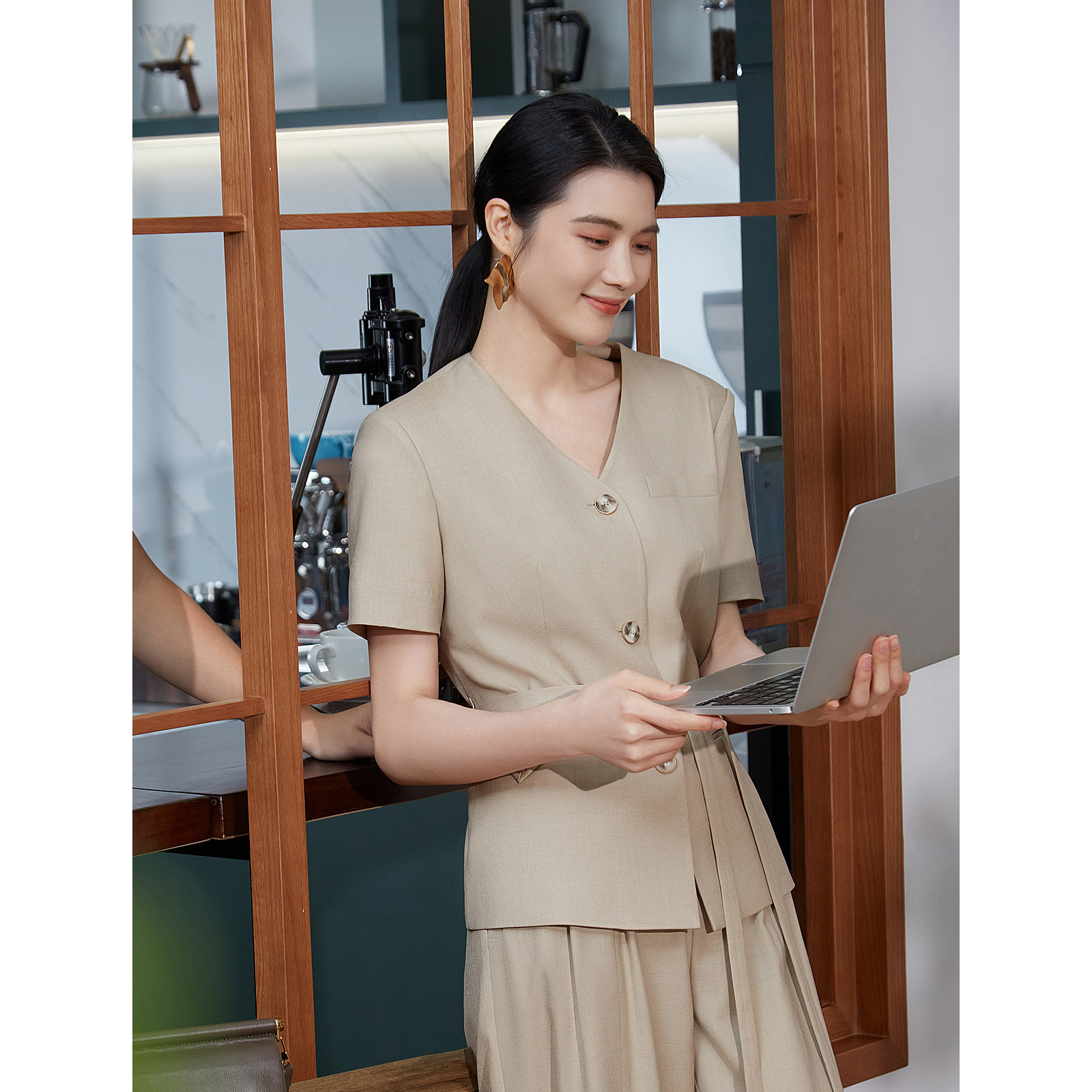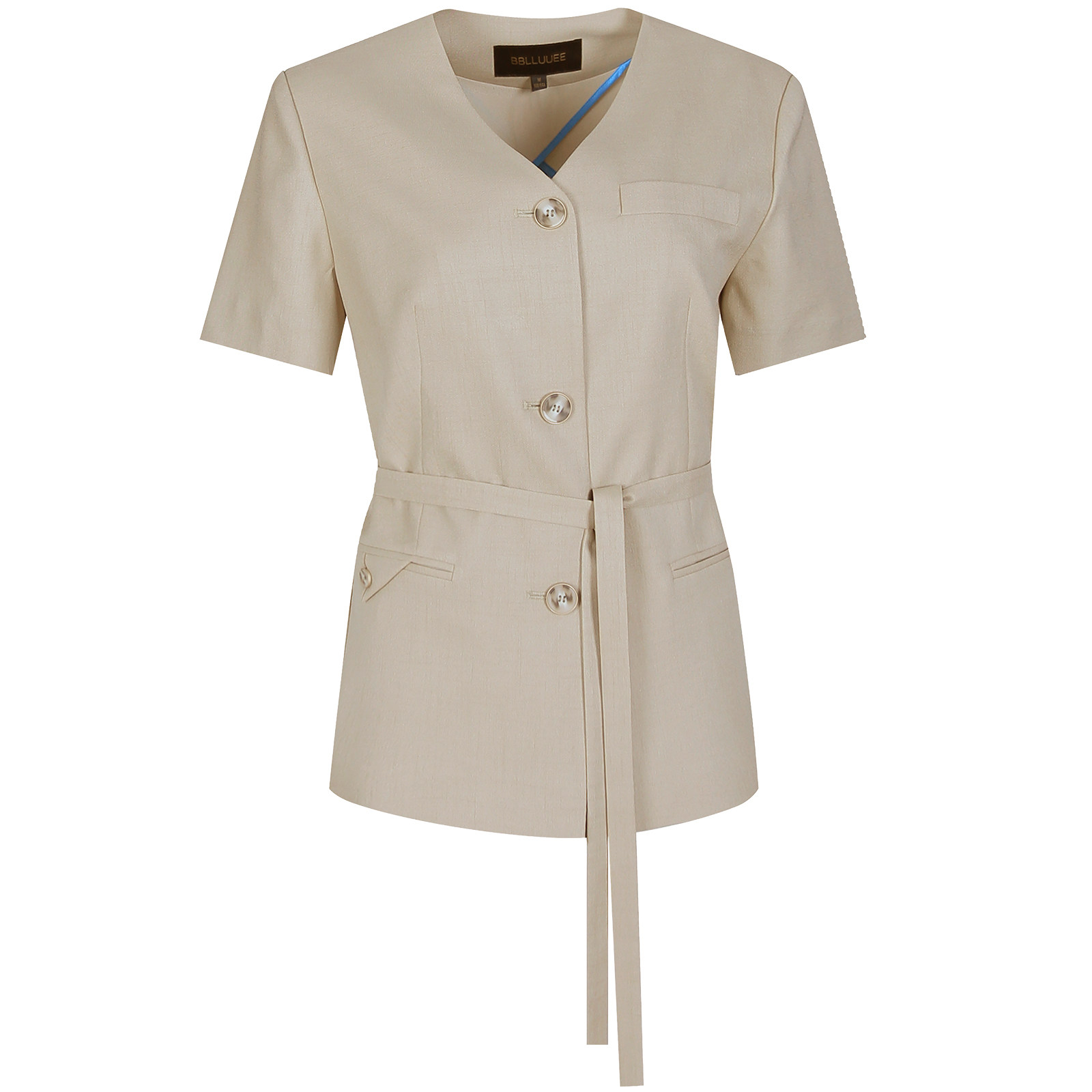 【商场同款】BBLLUUEE/粉蓝衣橱2025秋知性干练无领斜纹V领外套女