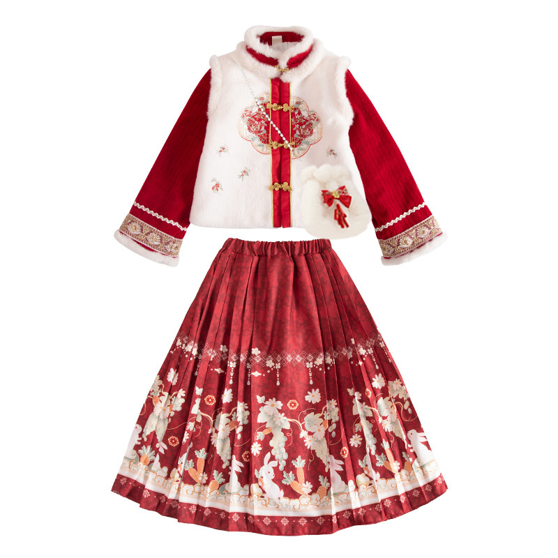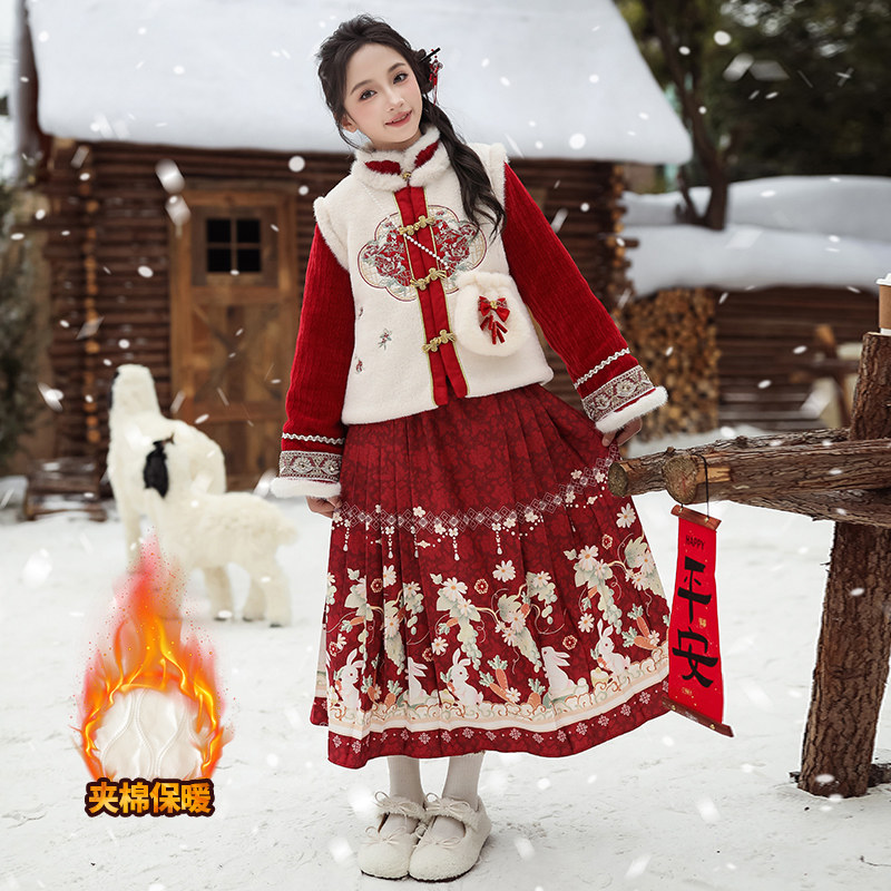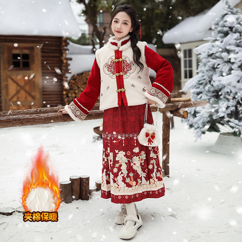 女童冬季马面裙套装2025新款洋气国风新年汉服裙小女孩加厚拜年服