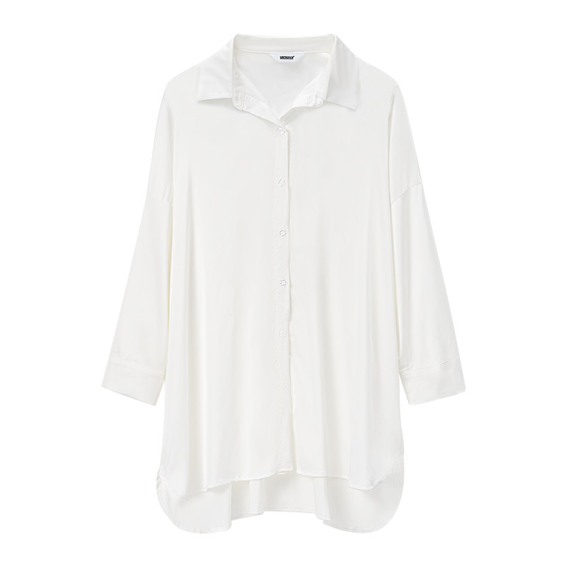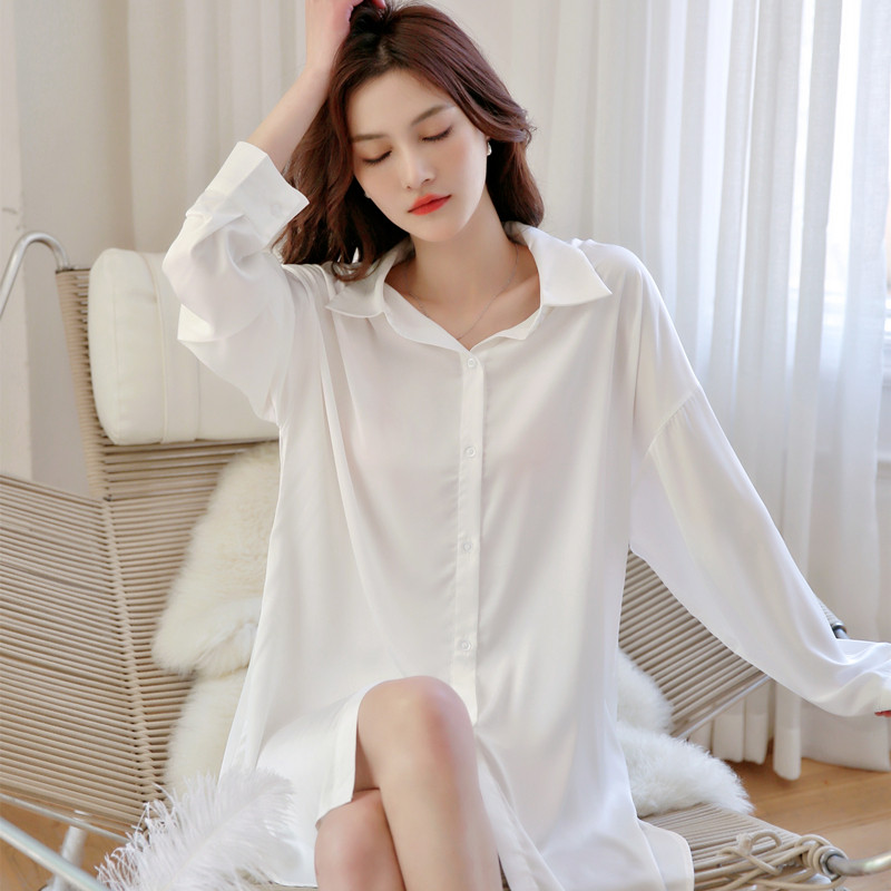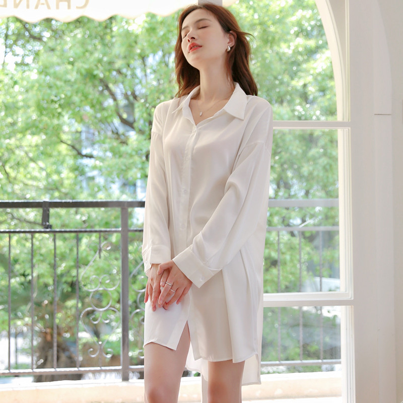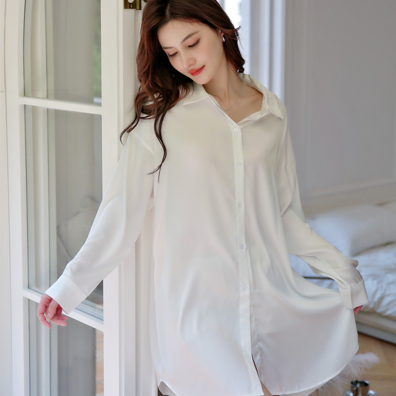 2025新款夏季薄款宽松性感冰丝白衬衫睡衣女春秋长袖丝绸衬衣睡裙