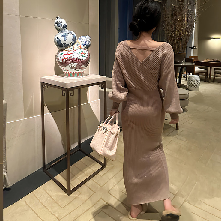 卢媛儿设计小众气质针织长袖连衣裙法式过膝毛衣裙女秋冬打底衫