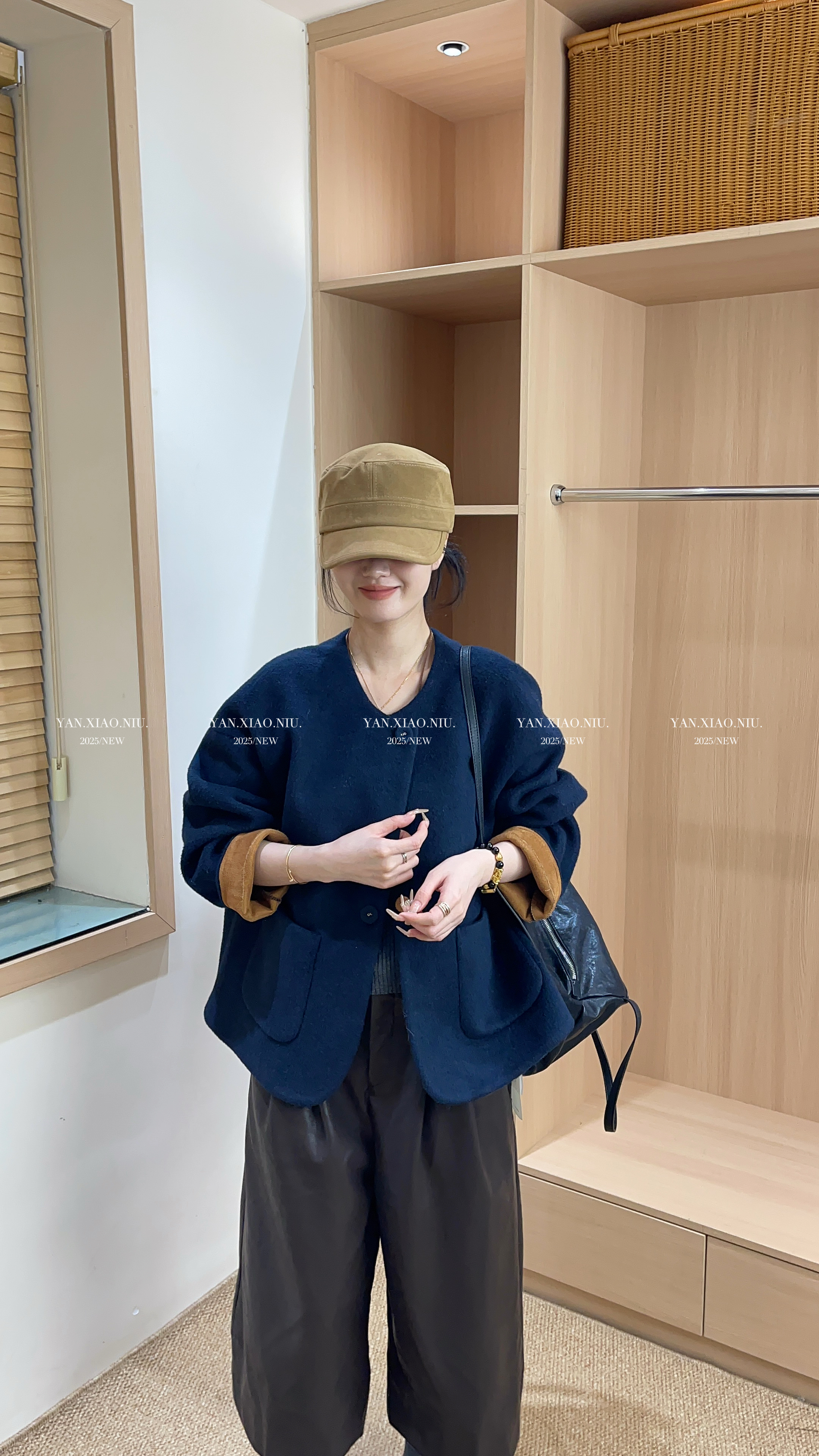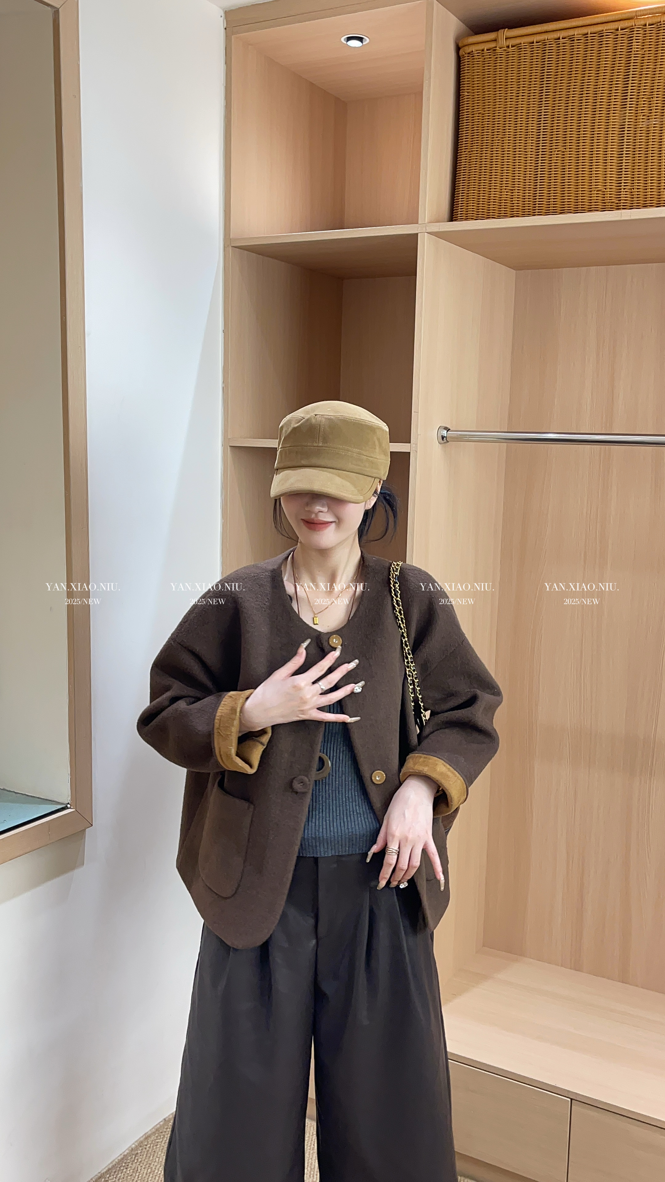 66066秋季新款韩版气质休闲拼色宽松显瘦百搭圆领毛呢外套女上衣