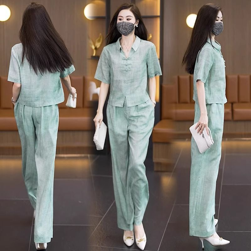新中式国风棉麻套装女夏季妈妈时尚休闲亚麻衬衫阔腿裤搭配一整套