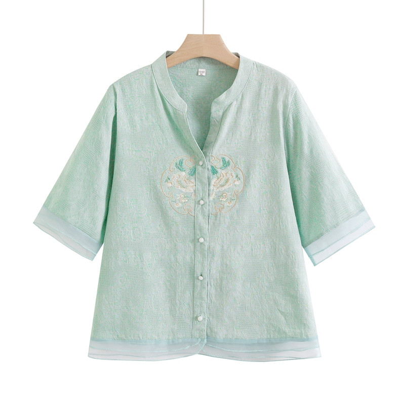 妈妈款夏季新中式棉麻短袖套装女洋气时尚刺绣衬衫中老年国风上衣