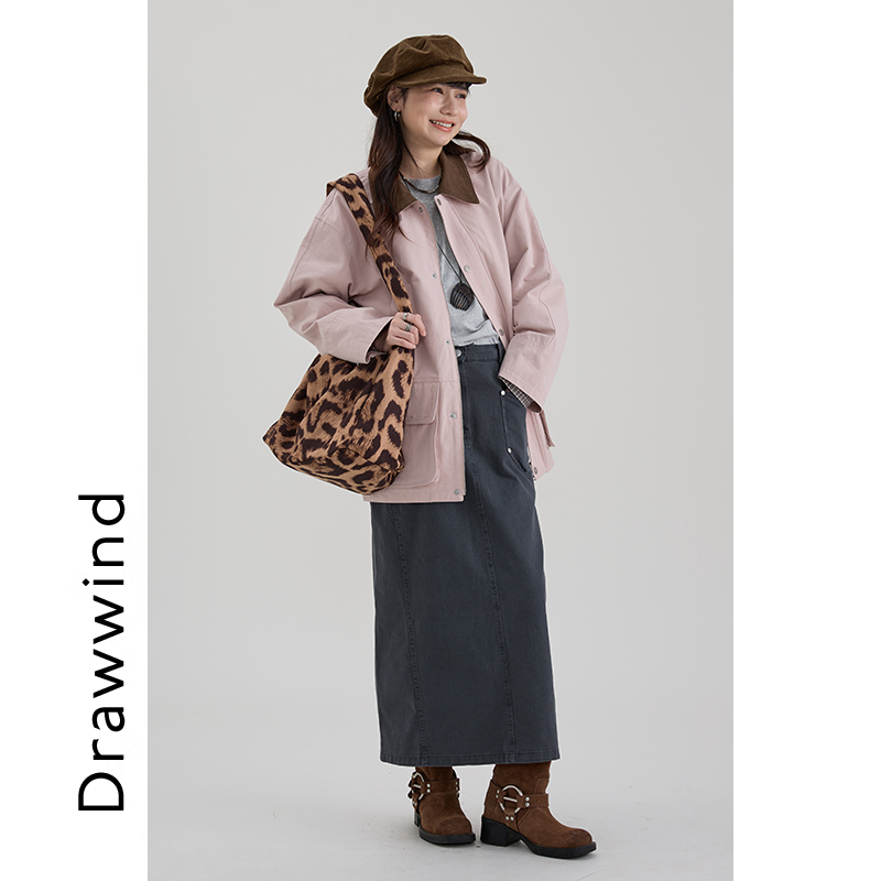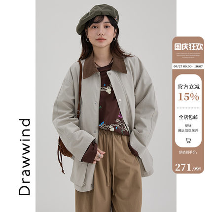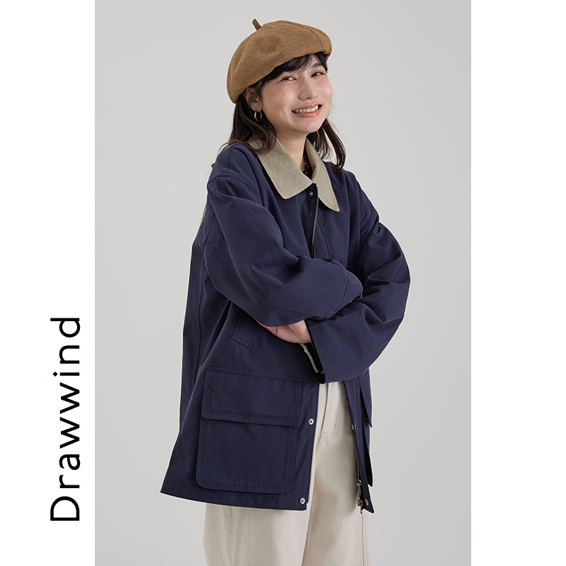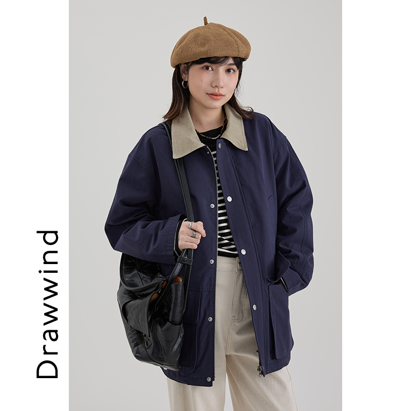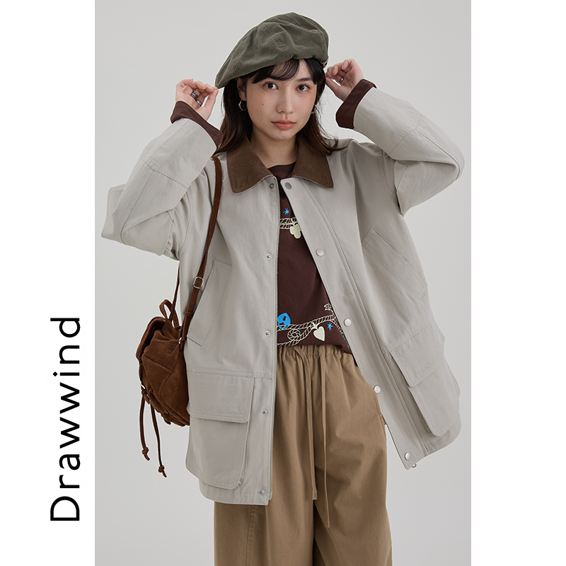 画风drawwind工装夹克女宽松拼色翻领大口袋短款外套2025秋季新款
