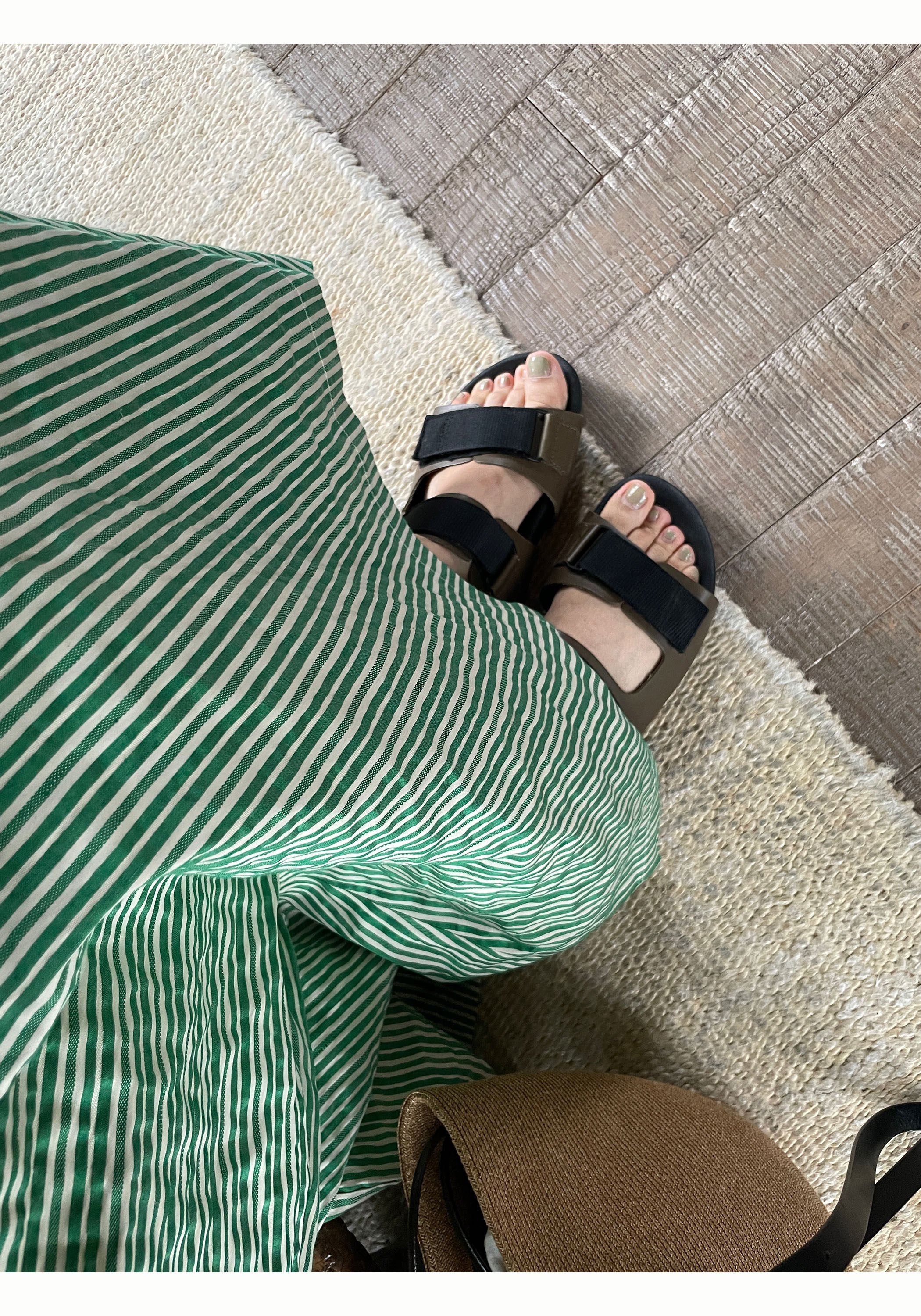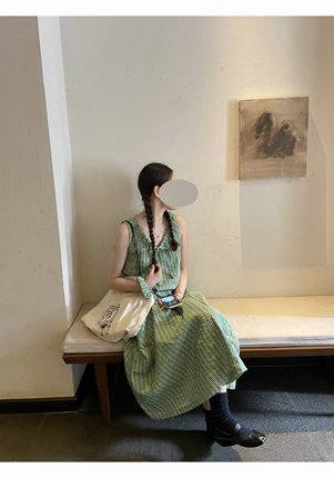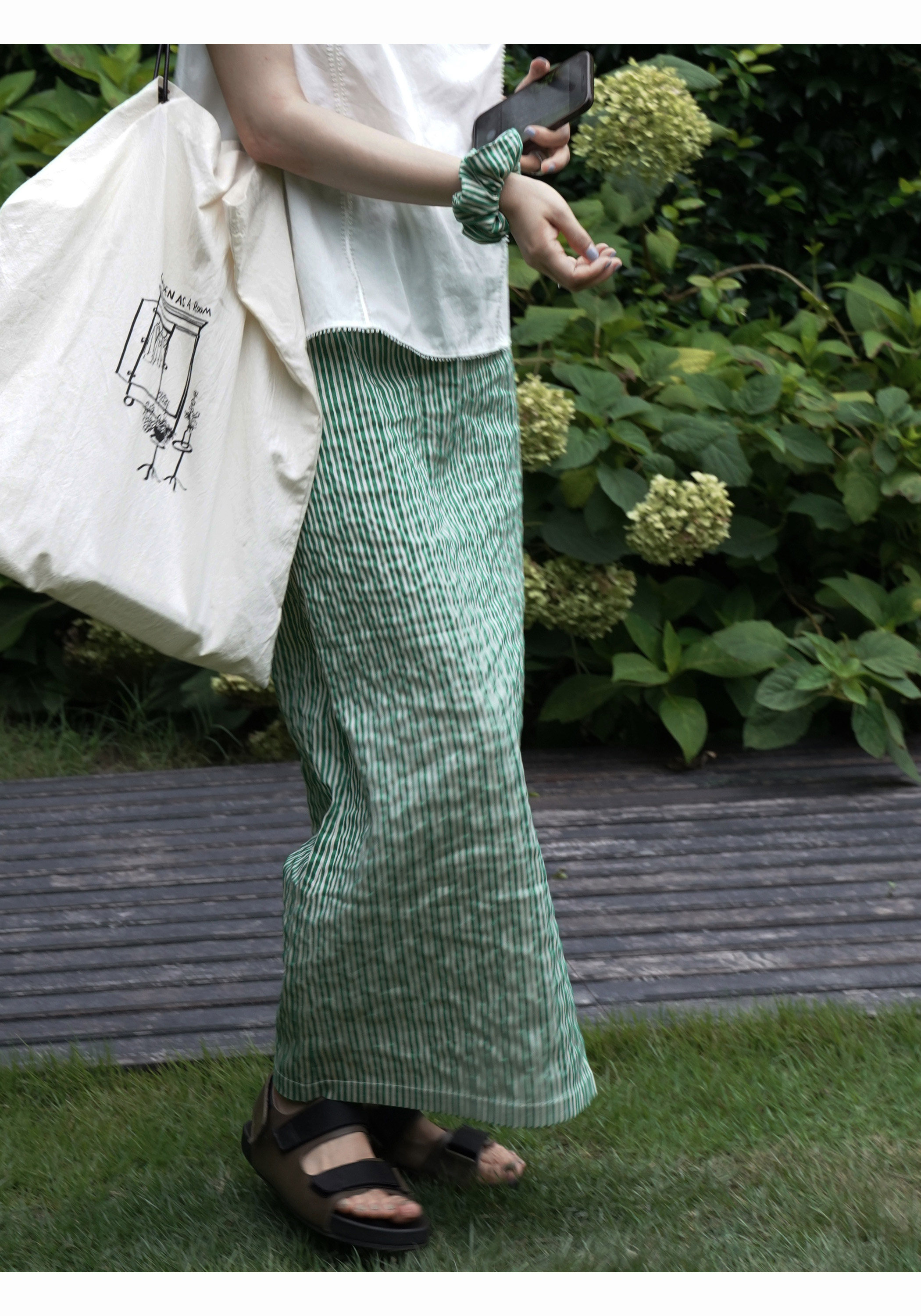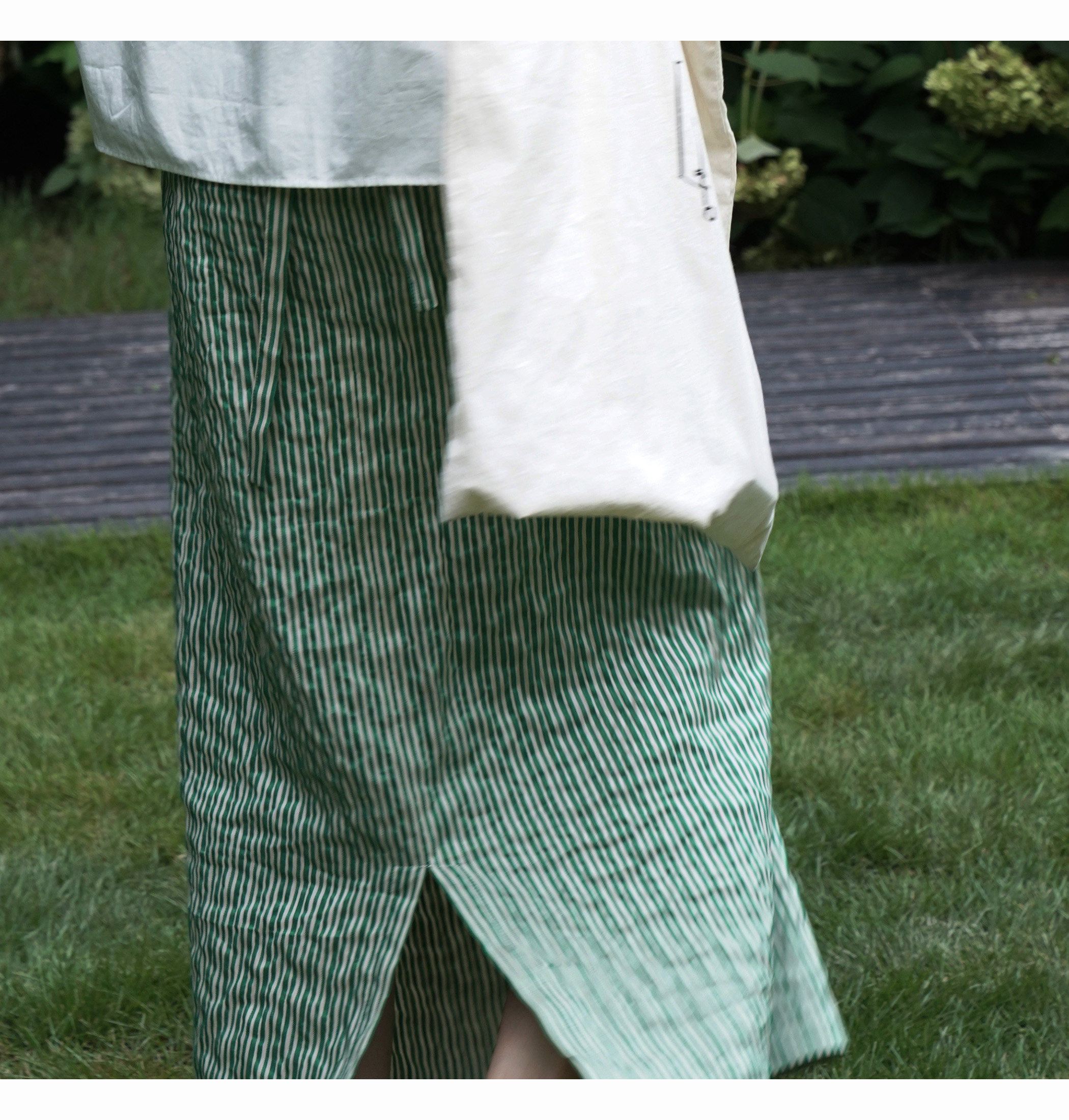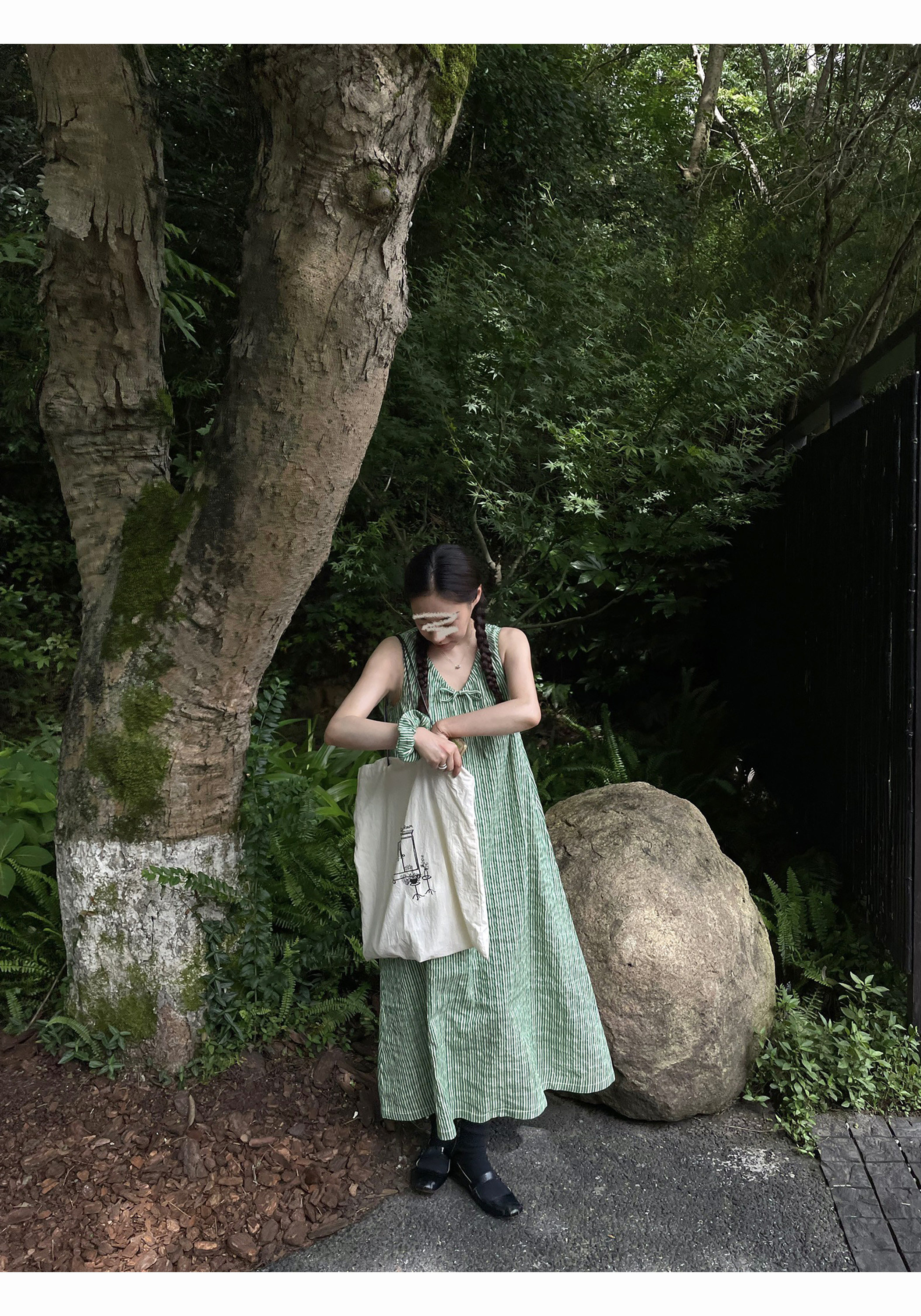AULDCAT 2023FW 真丝混纺色织绿条纹无袖连衣裙背心长裙 系带半裙